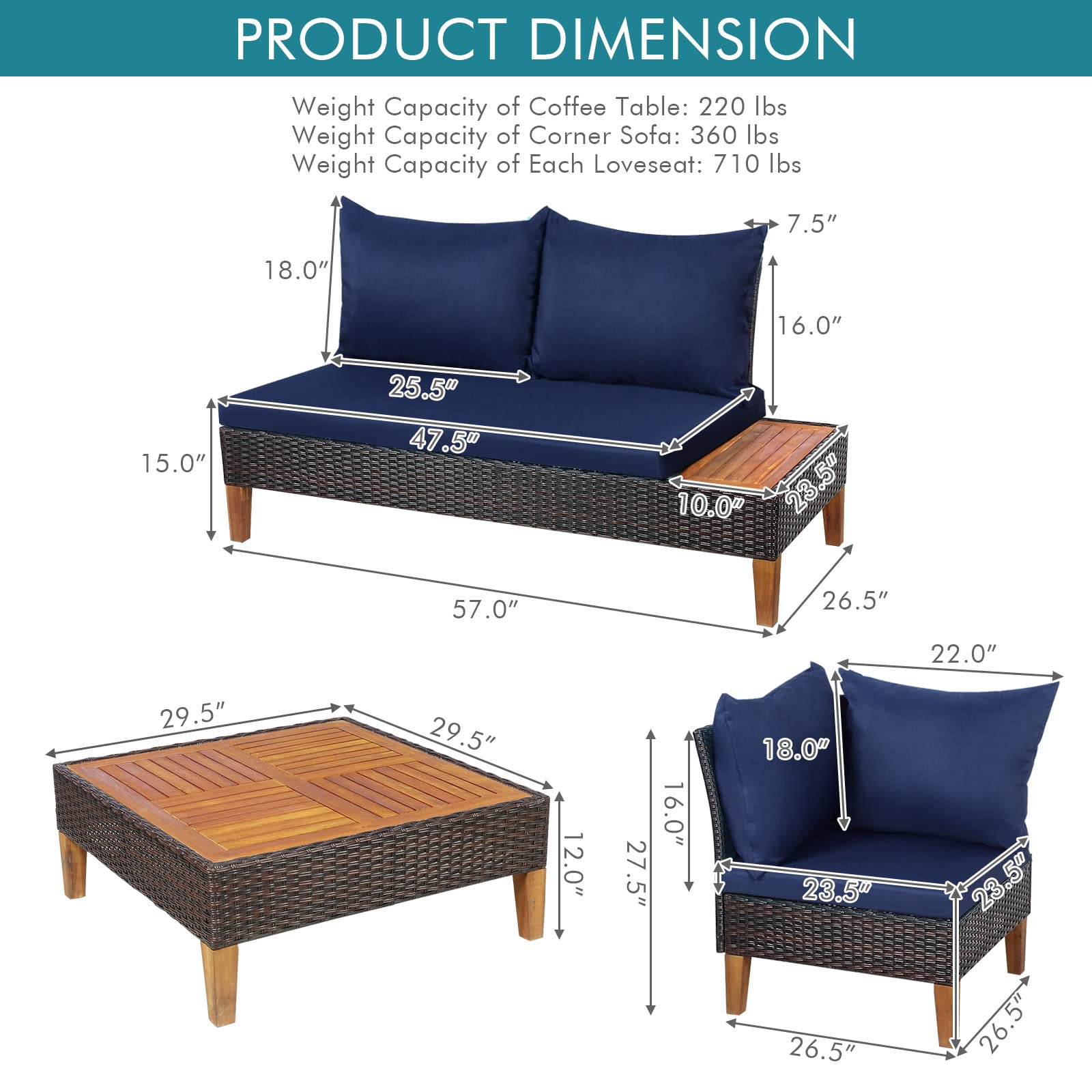 With comfy cushions, large seats, a practical coffee table, and 2 handy side tables, this outdoor conversation not only provides ultimate coziness for sitting but also brings large space for accommodating different items. What's more, the solid acacia wood, all-weather PE rattan, and rustproof steel frame make this patio sectional sofa set durable and stable while adding a modern and rustic touch to your outdoors. Therefore, you can place it on the patio, garden, backyard and poolside, etc.