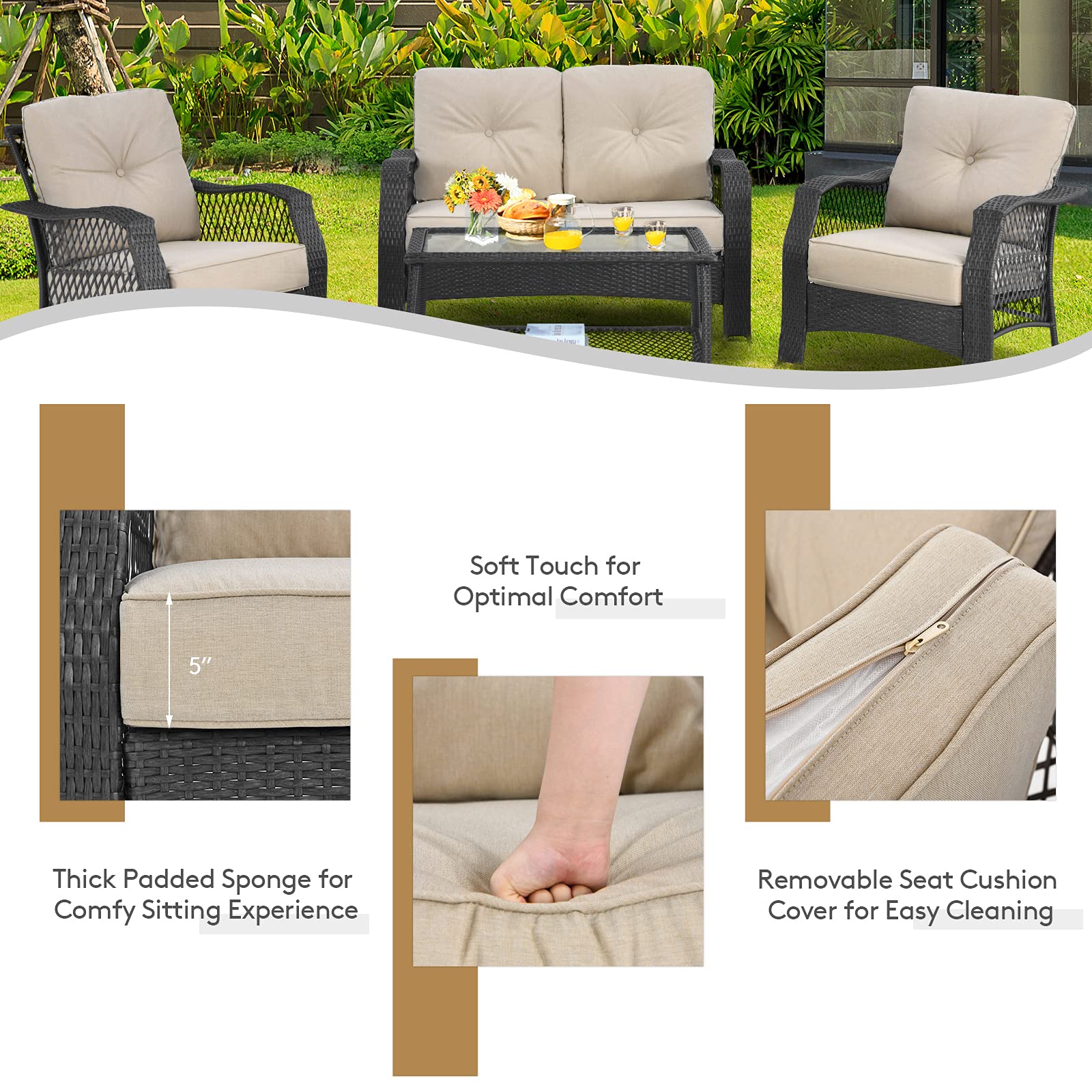 Create a cozy place for your outdoor gathering with this 4 pieces outdoor patio furniture set! With 1 loveseat, 1 coffee table, and 2 single chairs, this cushioned outdoor conversation set provides a comfortable area for you to entertain your friends while it can be placed into different shapes based on your location and preference. And the coffee table has an extra storage shelf, so you can store a lot of items on it rather than getting up and getting them. The all-weather PE rattan, anti-rust steel frame, and premium tempered glass can stay outside for long-lasting use.