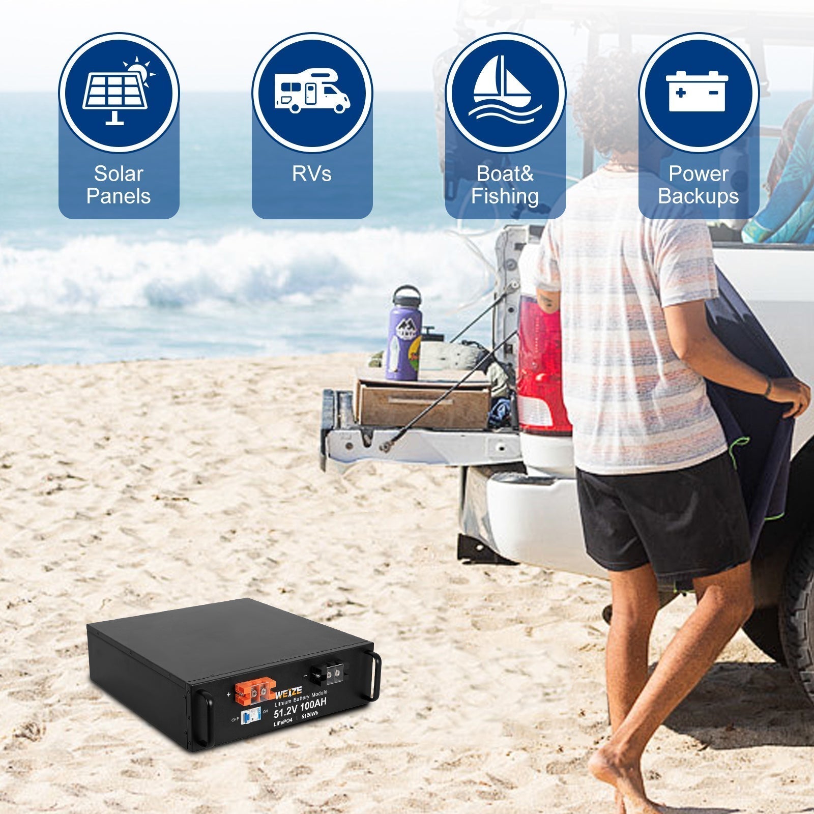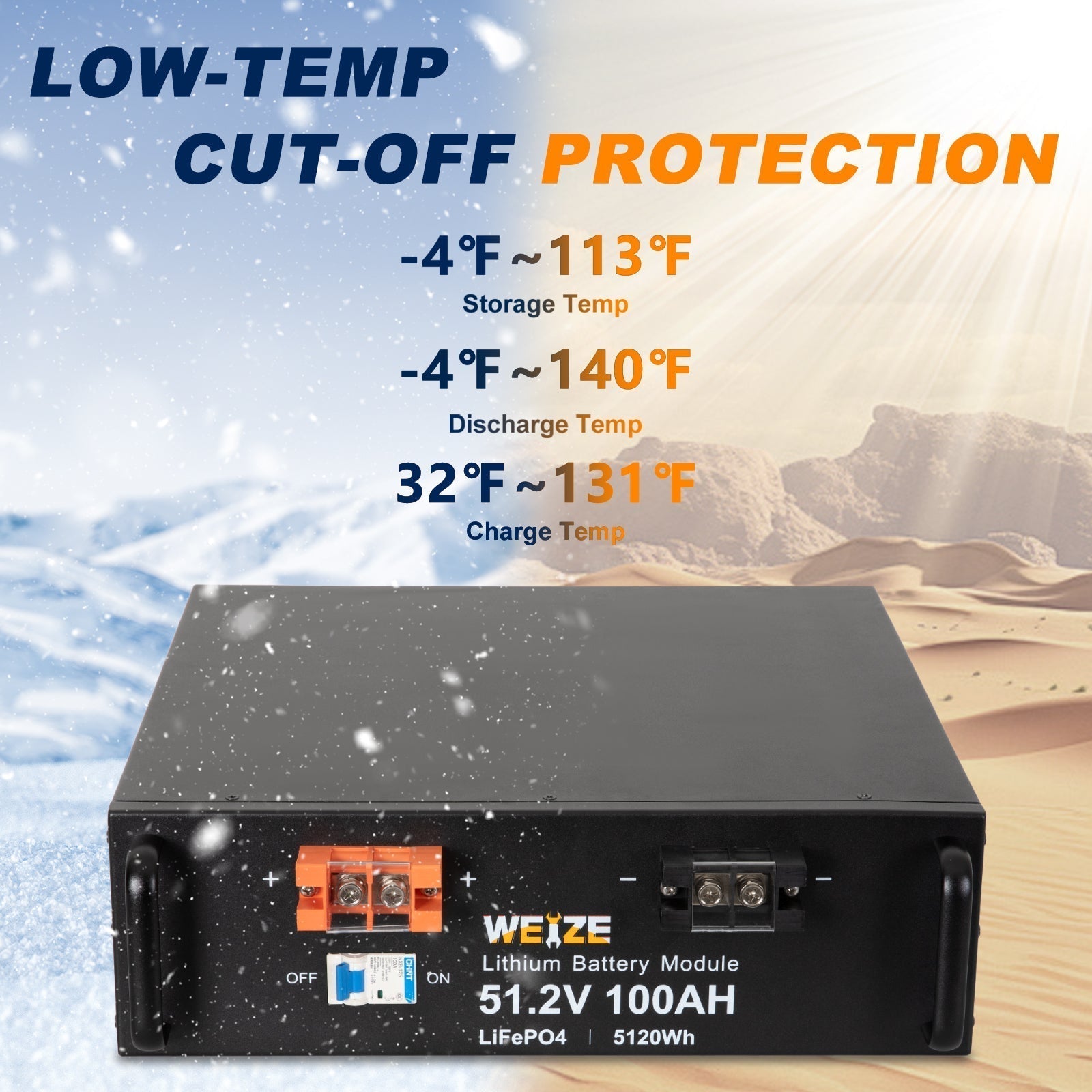 - High Capacity: The WEIZE 48V (51.2V) 100Ah LiFePO4 battery provides 5120Wh, ensuring long-lasting power for high-demand applications.