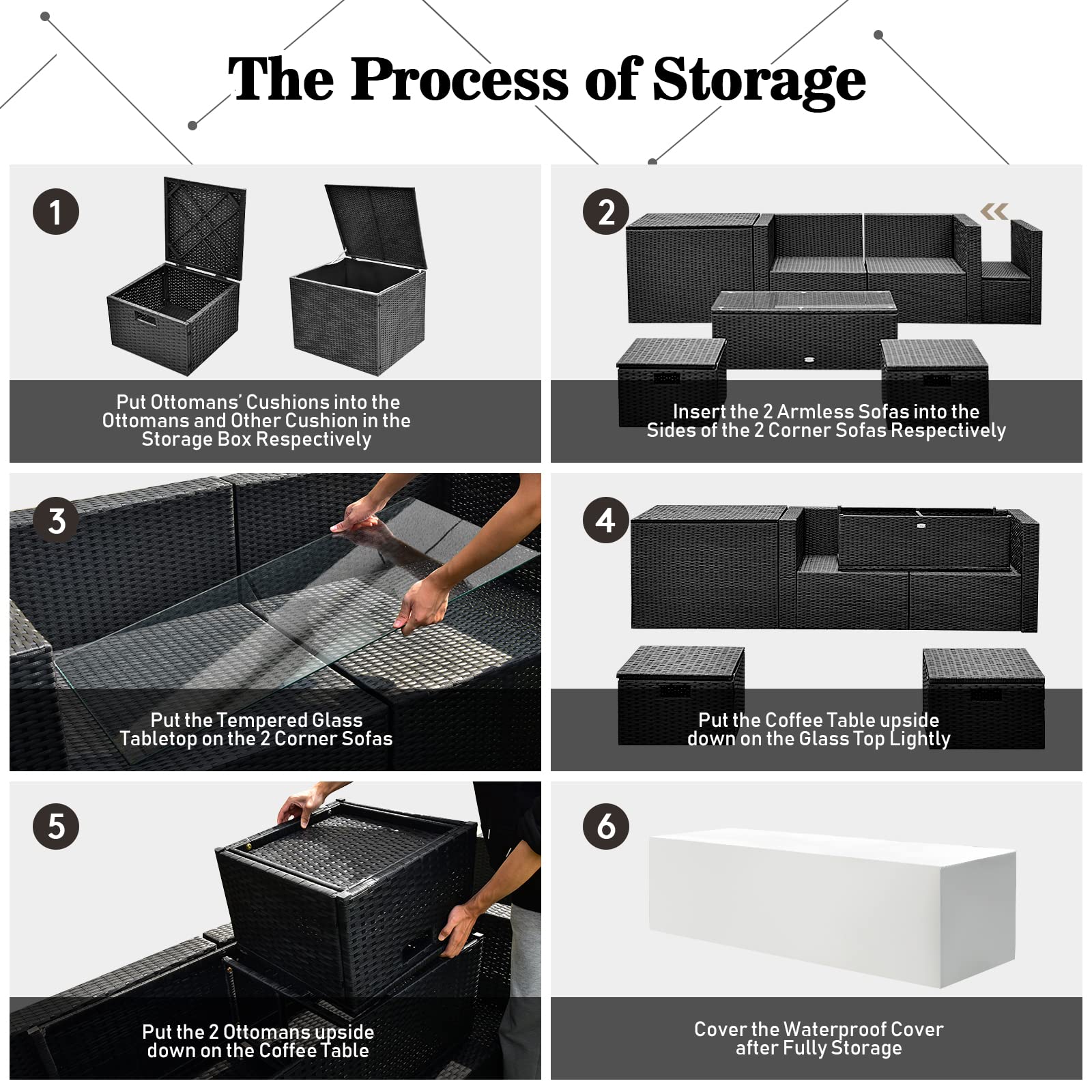 - Space-saving Design: Different from the common outdoor furniture set, this patio set can be stored in a compact size. Just put the seat and back cushion into a storage box and put the ottoman cushion into its storage space. Then store ottoman underneath its coffee table, and place an armless chair on the side of the corner sofa . Finnaly, you can get a compact size furniture sert, which size is 93β x 29.5β x 26β (L x W x H) in dimension.