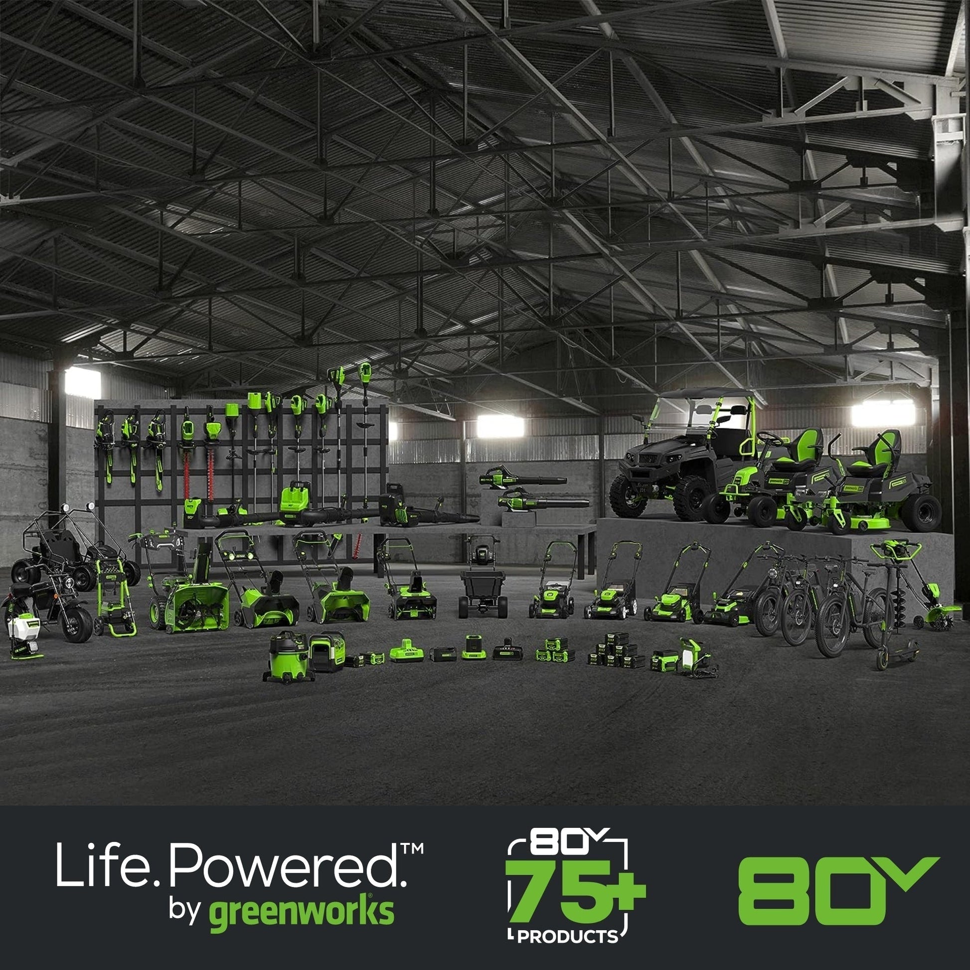 - Removable battery powers over 75 Greenworks 80-Volt tools.