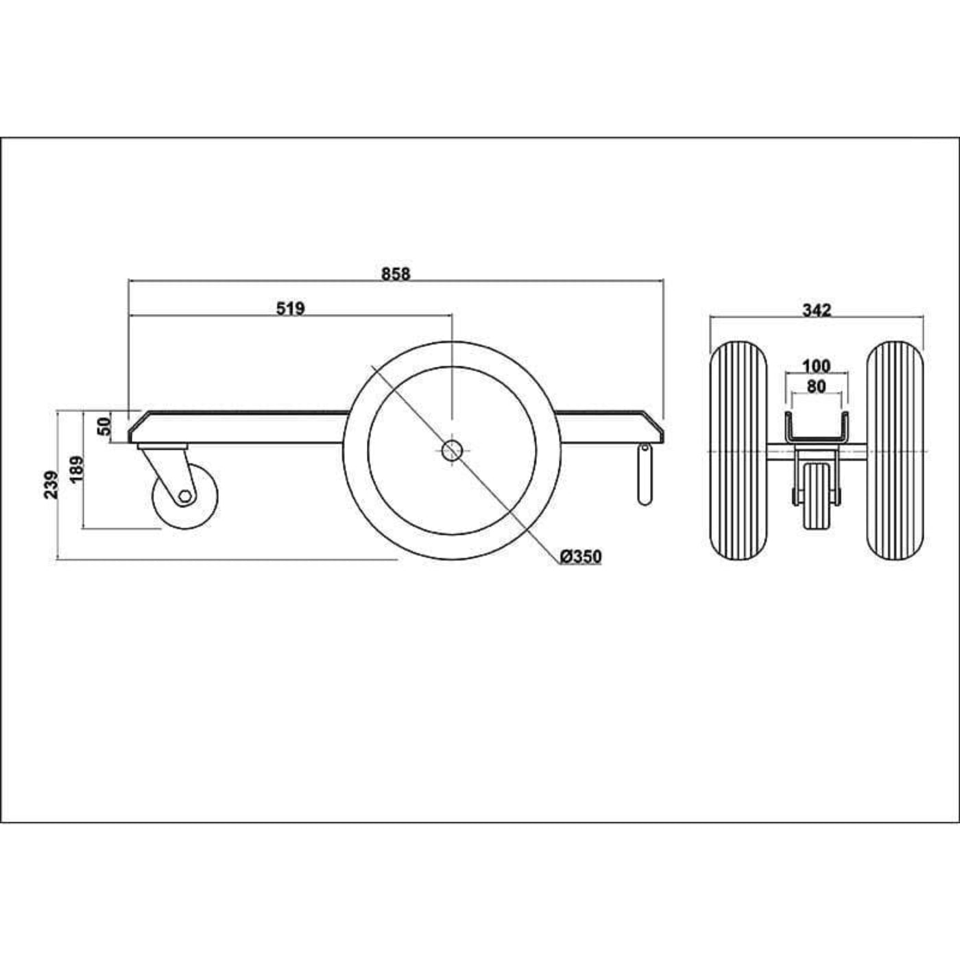 A: The trolley features two 325 mm (12.8") pneumatic rubber tires and one 140 mm (5.5") swivel caster, providing stability and ease of movement.