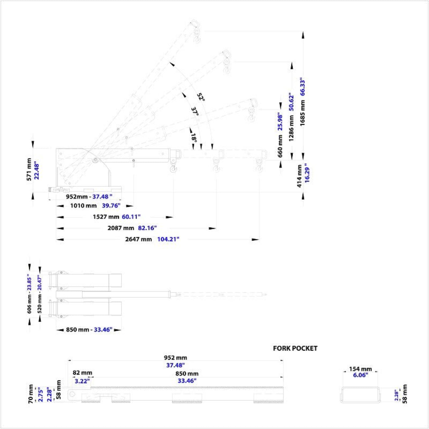 Adjustable Reach and Height: Telescopes from 1500 mm to 2600 mm (59" to 102.4") in 560 mm (22") increments, allowing flexibility in lifting operations.