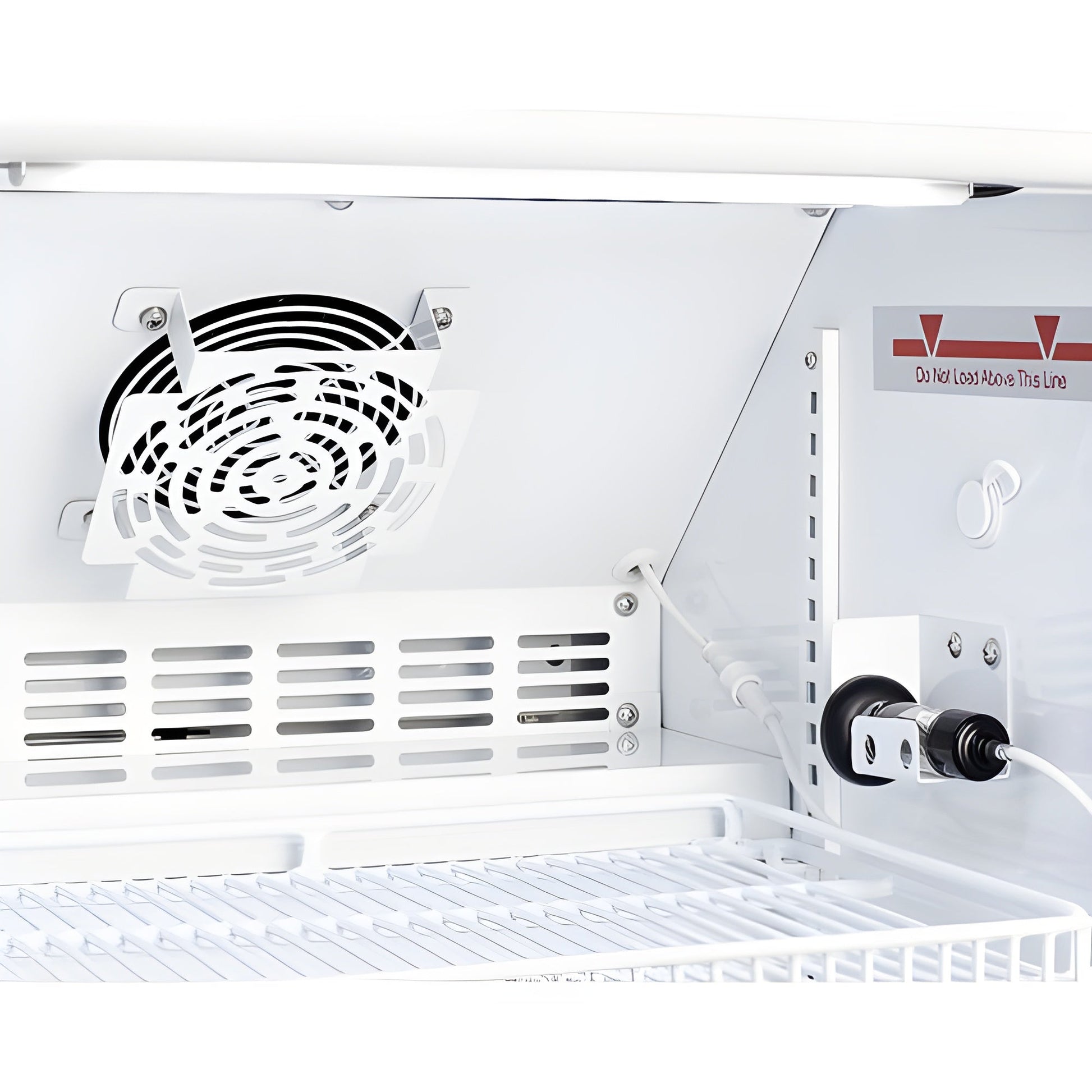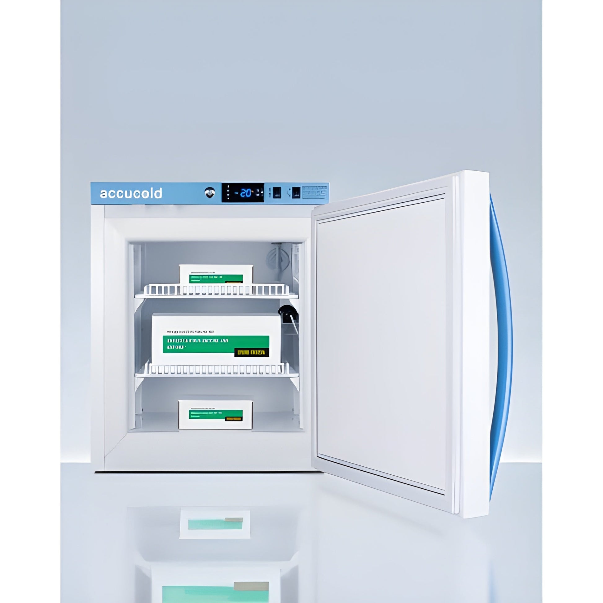 Accucold Performance Series Controlled Room Temperature CabinetThe ARG1PV-CRT is a 1 cu.ft. countertop unit designed for stable room temperature storage of medications. Pre-set to 72ºF, it offers an adjustable range from 68º to 77ºF. The microprocessor temperature controller is externally located to reduce door openings, and a buffered temperature probe in a glycol-filled bottle ensures accurate readings. The unit features an audible and visual alarm for temperature deviations, power failures, door openings, and sensor malfunctions. Additional remote alarm contacts and a 1/2" probe port allow for external monitoring. Inside, adjustable cycle defrost prevents temperature spikes, while optimized forced air cooling maintains uniform conditions. The unit includes LED lighting, adjustable wire shelves, and a white powder-coated metal interior for durability. The exterior features a double pane tempered glass door with a factory-installed lock, antimicrobial handle, and user-reversible self-closing function. A hospital grade cord with a green dot plug ensures safe operation in high-traffic areas.