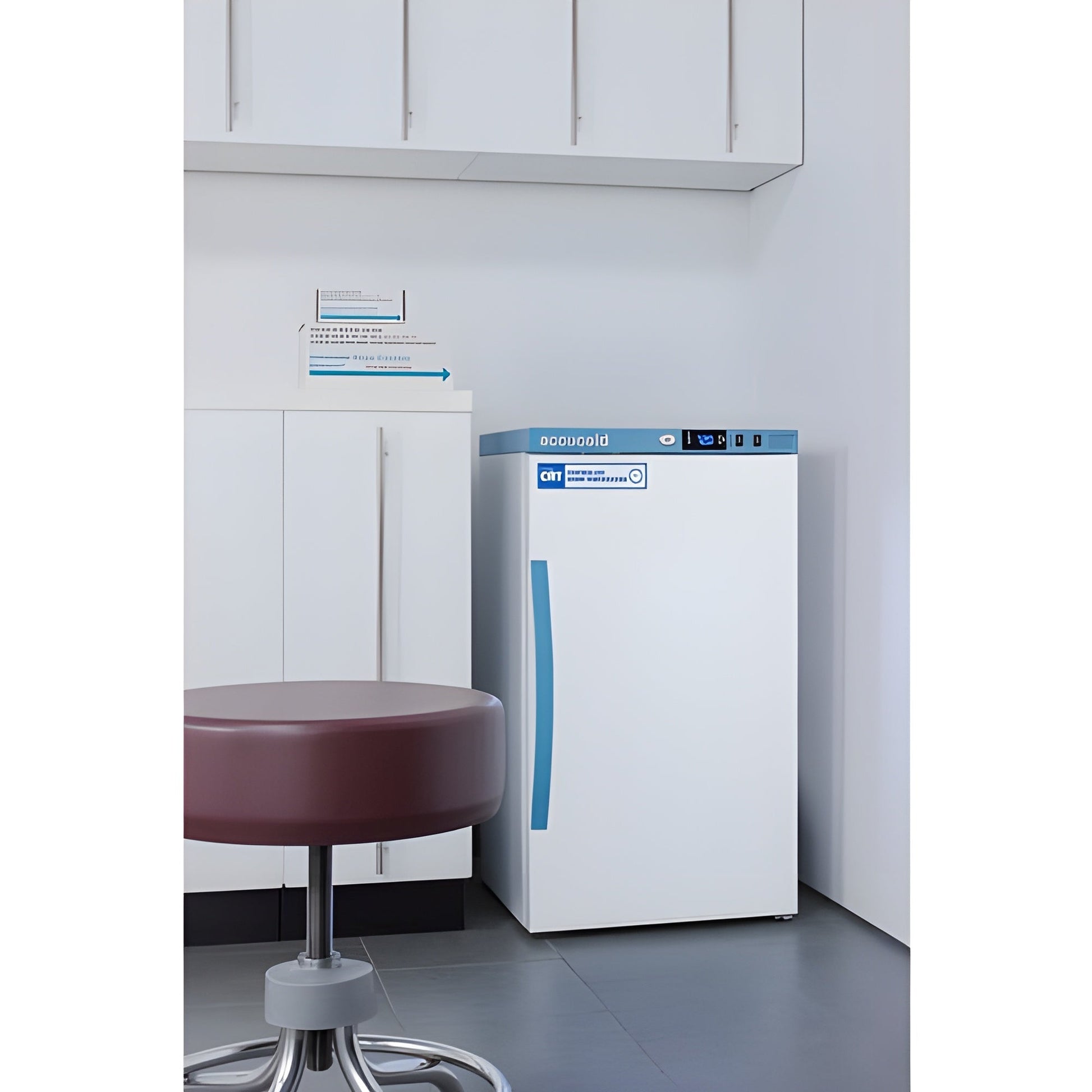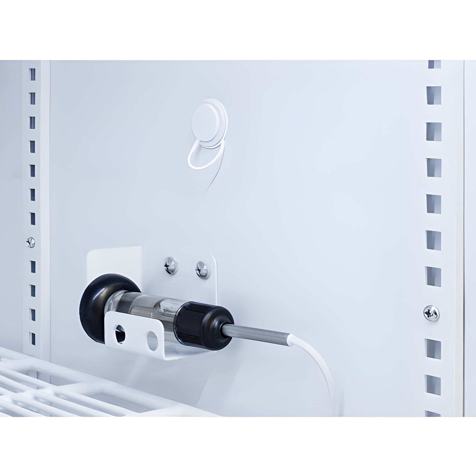 Accucold Performance Series Controlled Room Temperature CabinetThe ARS1PV-CRT is a 1 cu.ft. countertop unit pre-set to 72ºF, with an adjustable range from 68º to 77ºF. The microprocessor temperature controller is externally located to minimize door openings, helping to protect stored contents from ambient temperature. The buffered temperature probe is encased in a glycol-filled bottle to better simulate temperature of the stored product, with an additional sensor that reads air temperature for superior temperature control. The current and min/max temperature display is viewable in Celsius or Fahrenheit to the nearest tenth of a degree. The audible and visual temperature alarm alerts users if the interior goes out of range. Additional alarms include power failure, door open, and sensor failure alerts. This unit features remote alarm contacts and a 1/2" probe port for external monitoring. The hospital grade cord</b> with a ‘green dot’ plug enhances safety in high-traffic areas.