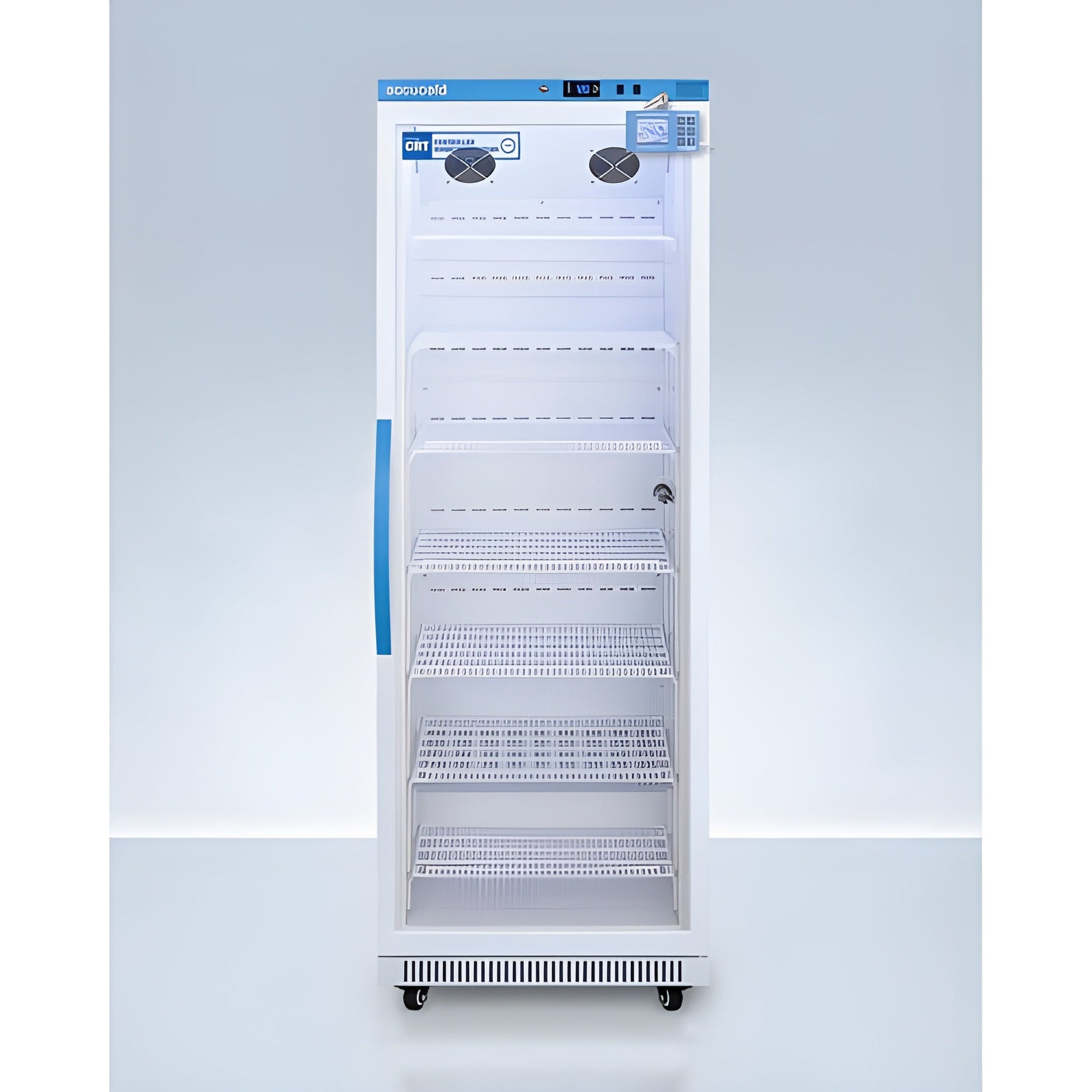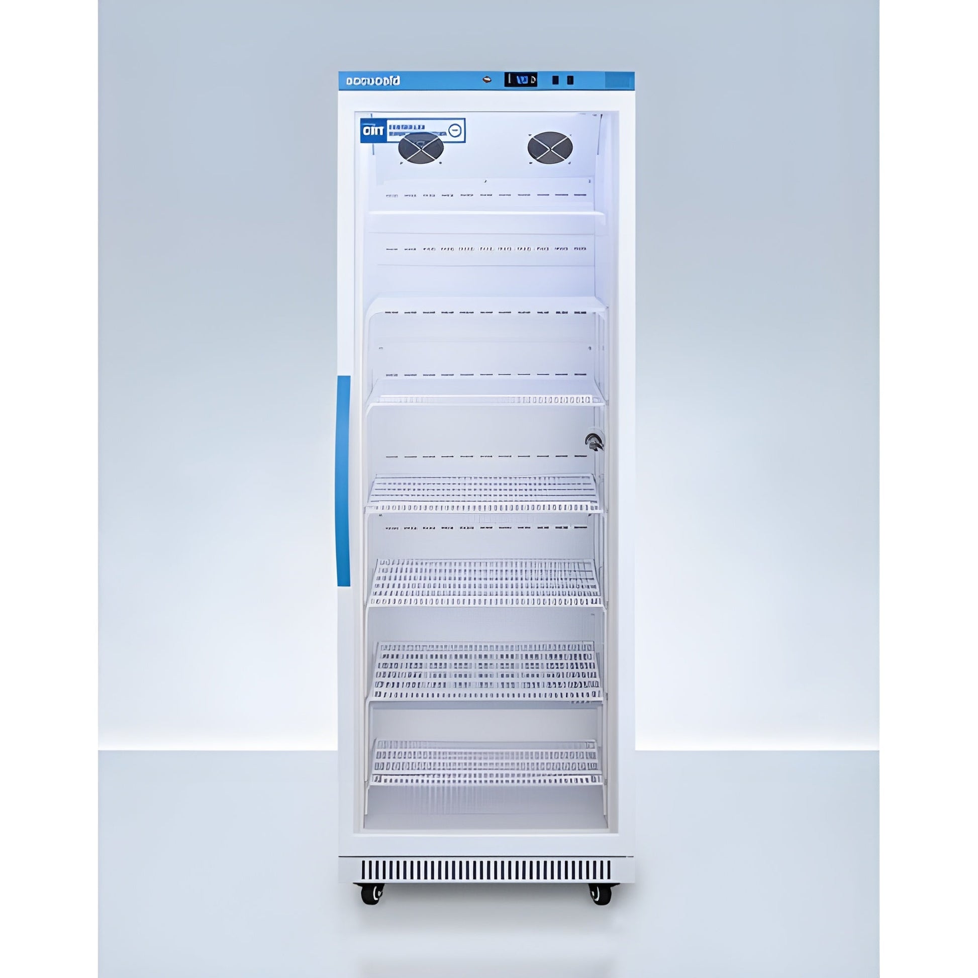 Performance Series Controlled Room Temperature CabinetThe ARG8PV-CRT is an 8 cu. ft. upright storage unit designed for medications requiring a stable room temperature environment. It is pre-set to 72ºF, with an adjustable range from 68º to 77ºF. A microprocessor temperature controller minimizes door openings, while a buffered temperature probe ensures precise readings. The display shows current and min/max temperatures in Celsius or Fahrenheit. Alarms for temperature deviations, power failure, door open, and sensor failure provide added safety. The unit features adjustable cycle defrost, optimized forced air cooling with dual internal fans, and seven adjustable shelves. Interior LED lighting, a powder-coated antimicrobial handle, and a double-pane tempered glass door enhance functionality. The door is user-reversible with a self-closing mechanism and a factory-installed lock. Additional features include remote alarm contacts, a 1/2" probe port for monitoring devices, and a hospital-grade cord with a 'green dot' plug for safety in high-traffic areas.