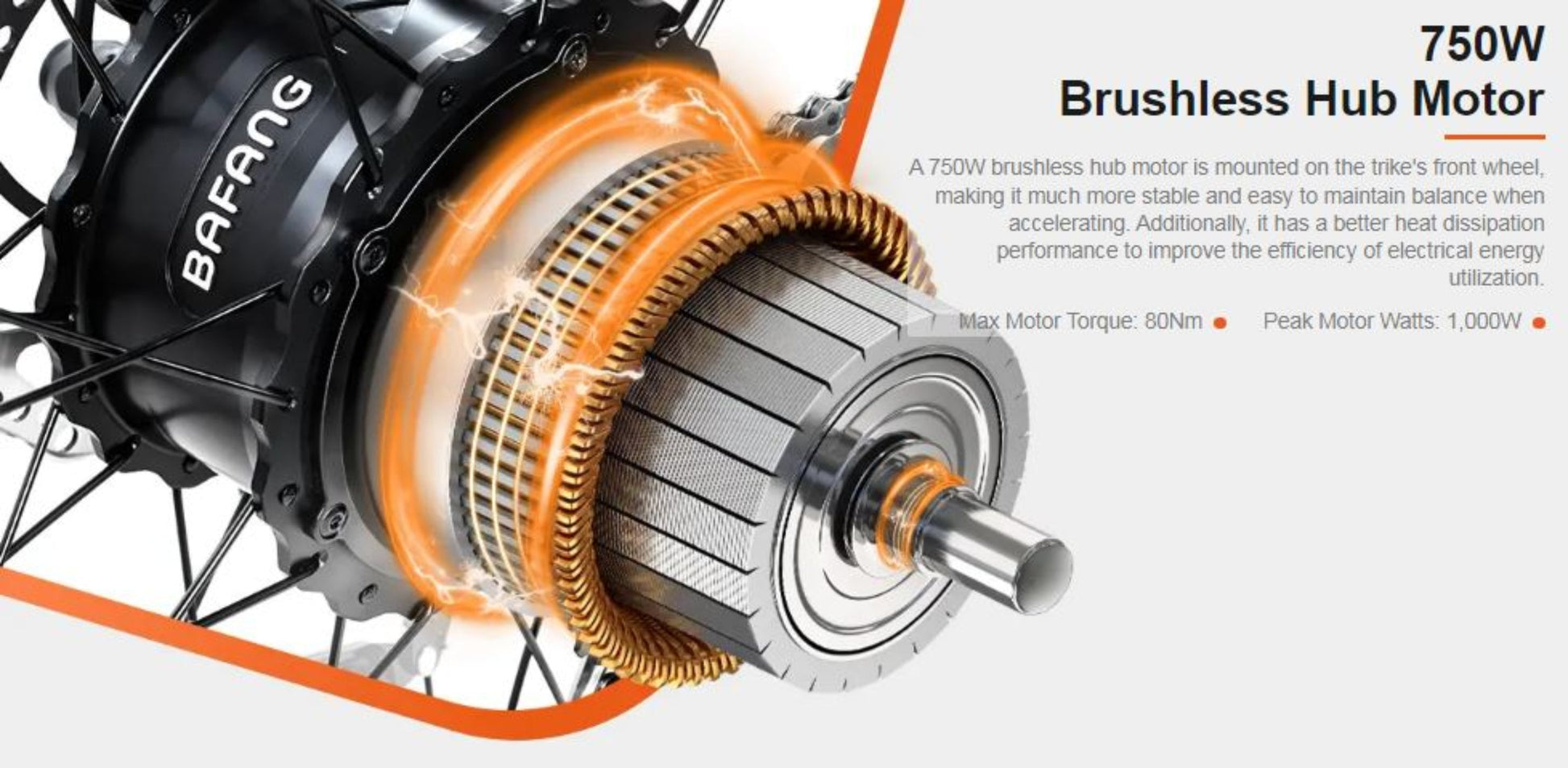 Powerful Performance: Equipped with a 750W brushless hub motor, the trike offers robust assistance, making uphill climbs and longer rides more effortless.