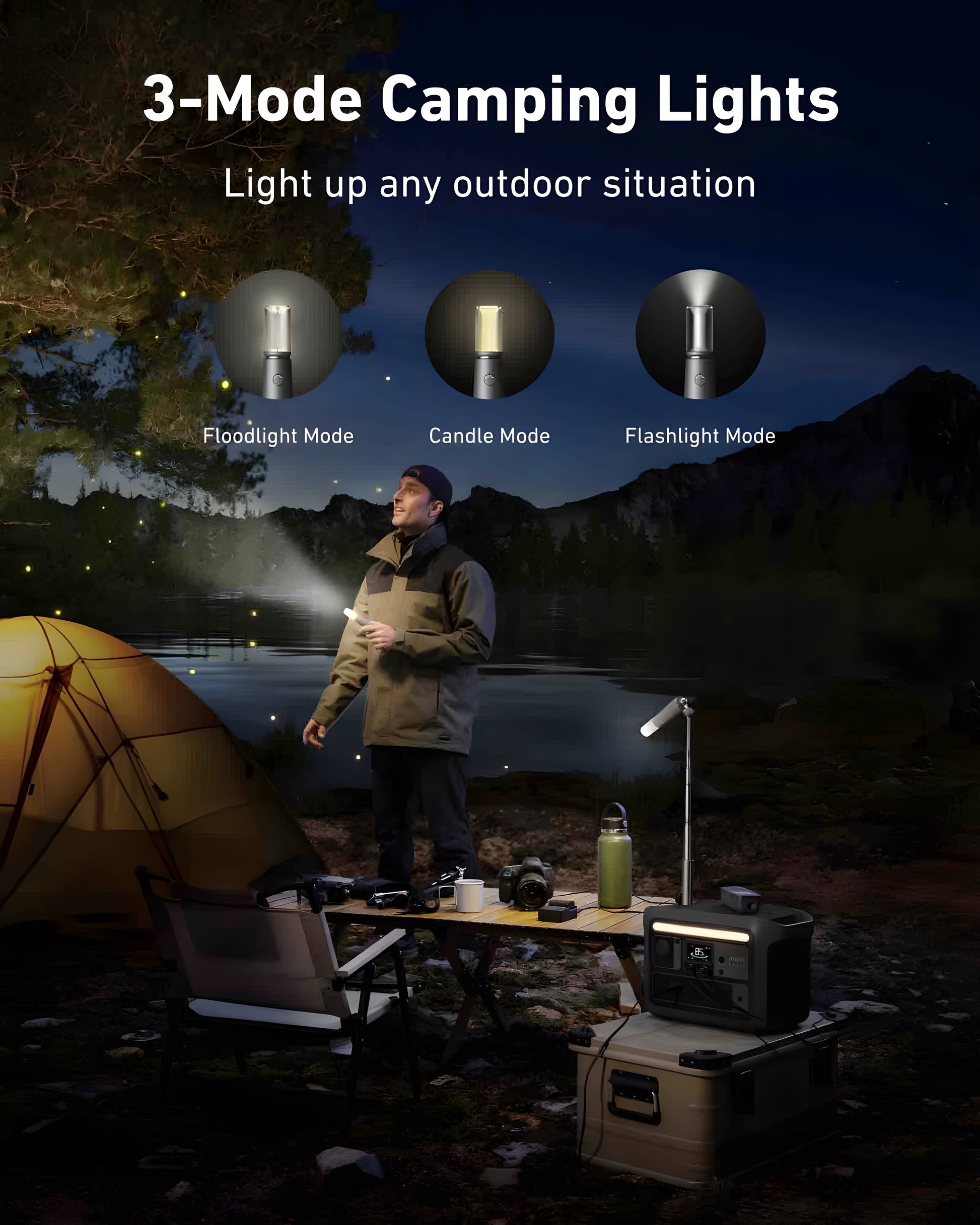 The Anker SOLIX C800X is your on the go power companion, with 768Wh capacity and 1200W output to power all your devices while lighting up your campsite. Equipped with 10 charging ports, it ensures you can charge a variety of devices simultaneously. This power station features 3-mode camping lights with two detachable flashlights. Smart app control lets you manage your power from anywhere with the Anker app. Set the battery status or recharging speed, and connect via Bluetooth or Wi-Fi.