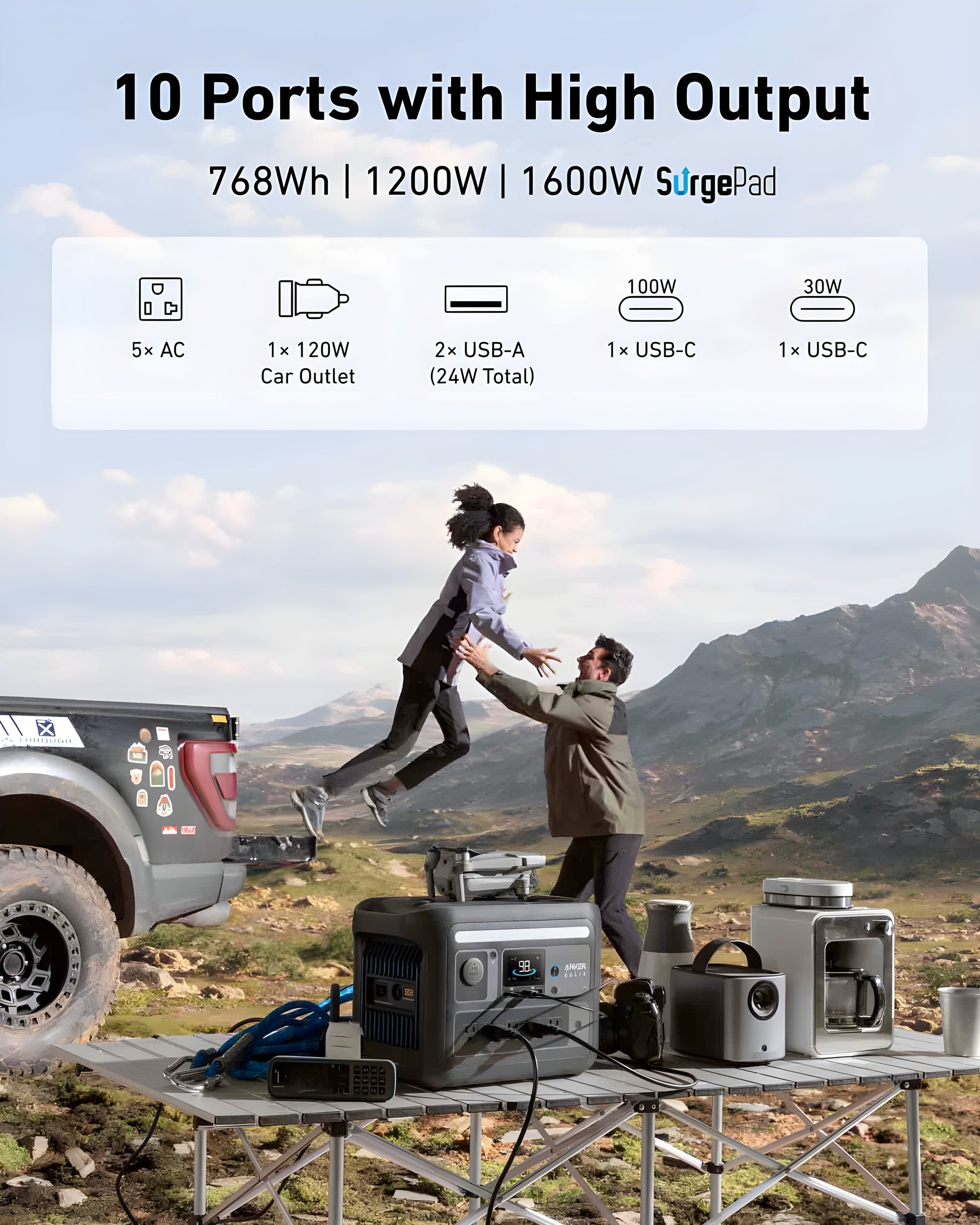 A: A 768Wh, 1200W portable power station designed for outdoor adventures, emergency backup, and off-grid power needs.
