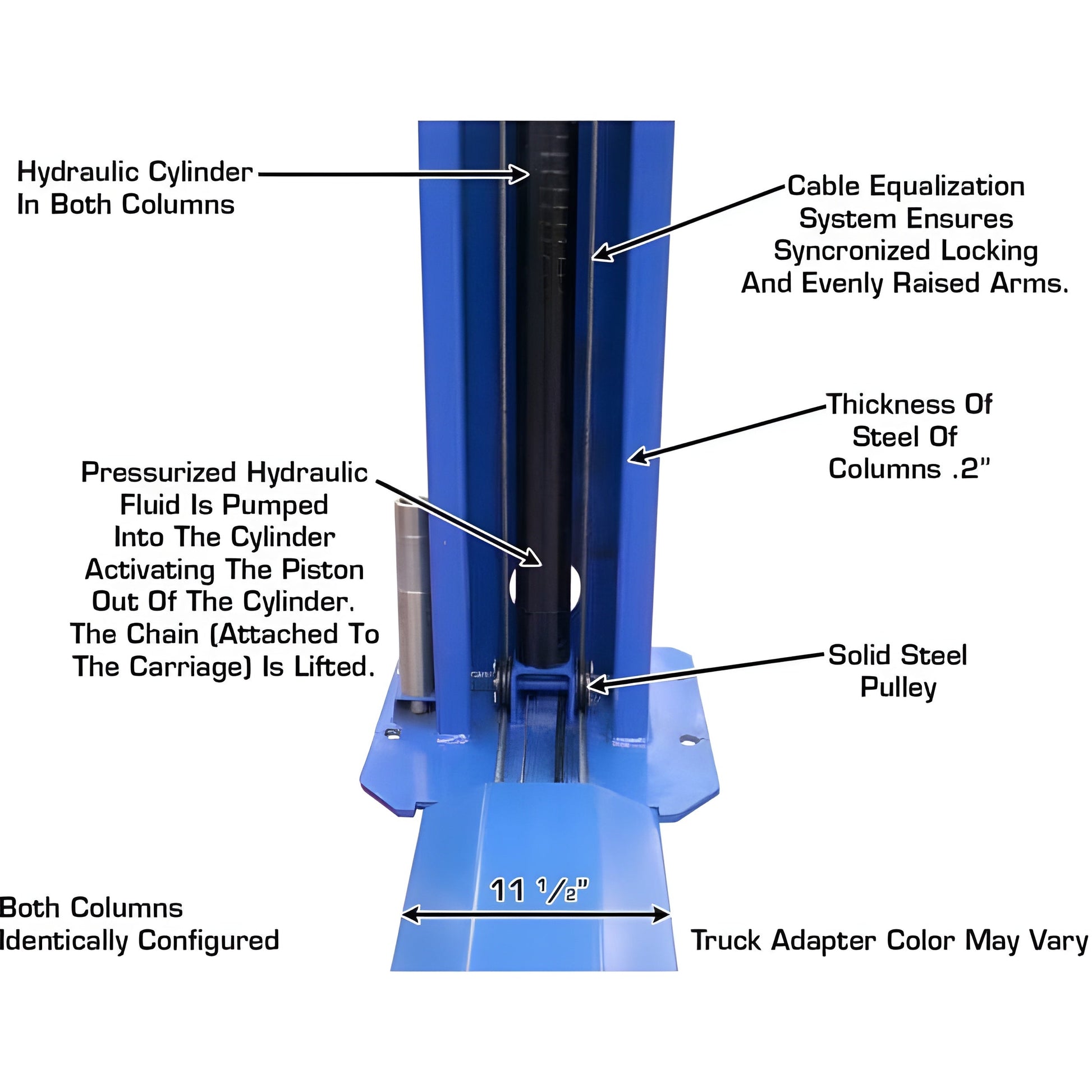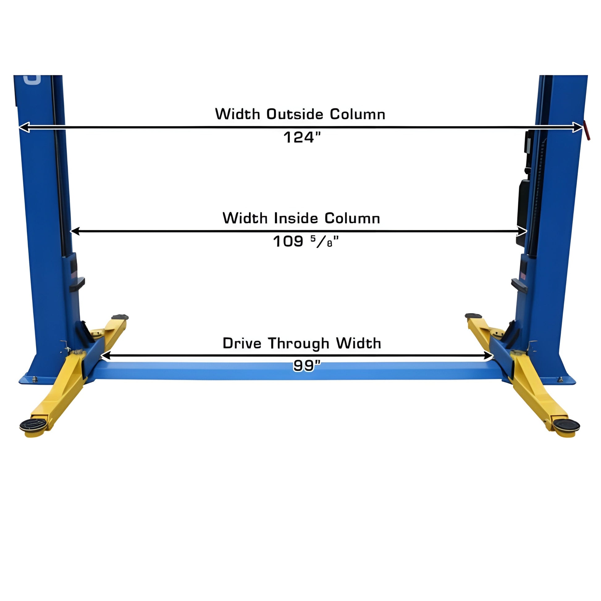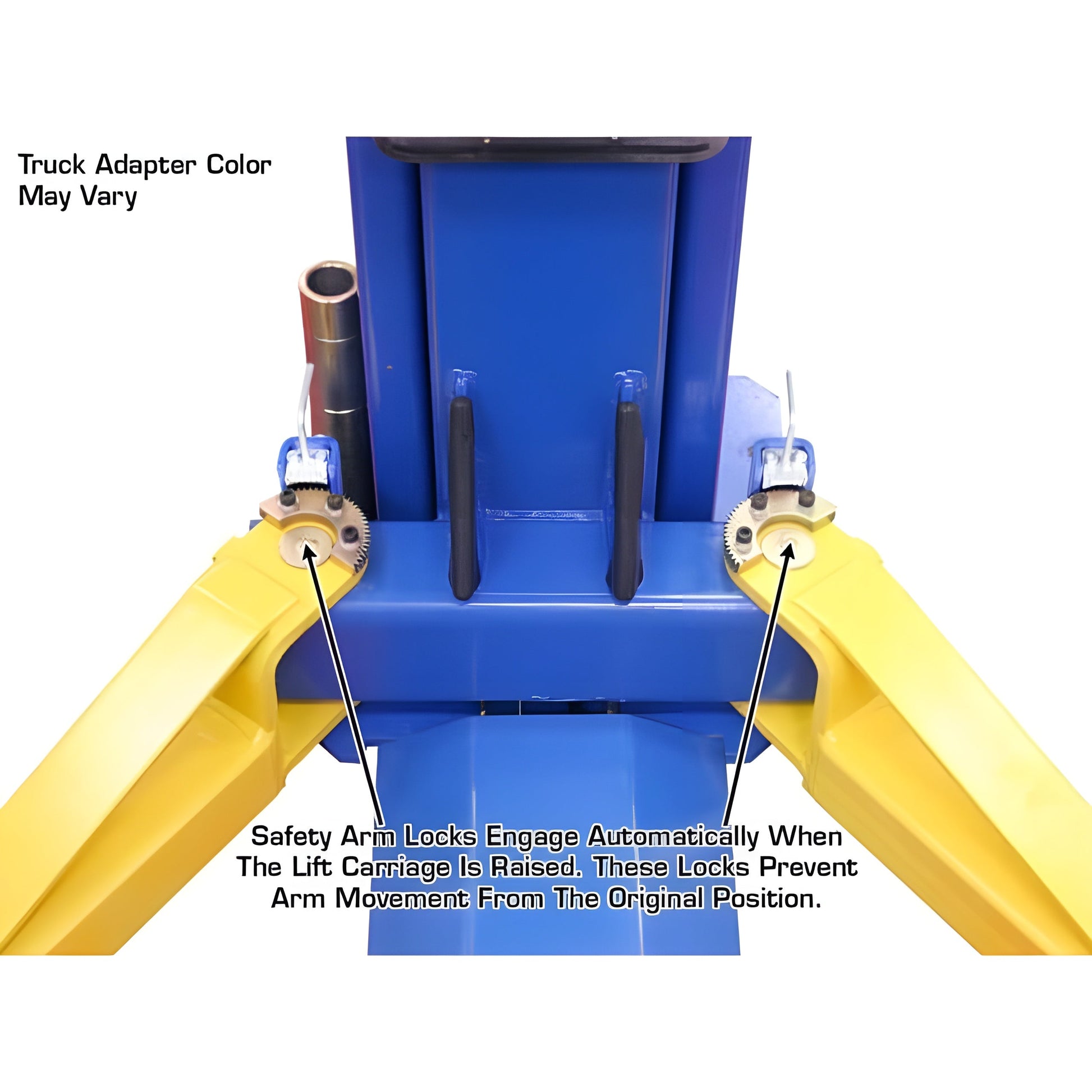 The Atlas BP8000 is a baseplate two-post lift designed for low ceiling garages. The total column height of 108 inches or 9 feet allows this lift to be installed in almost any professional or home garage with a ceiling as low as 9 foot 3 inches. The BP8000 also has many of the popular features found on larger more expensive lifts, including a single-point lock release, Super-symmetric arms, and a twelve piece truck adapter set. This combo includes the Atlas Lawn Mower Adapter or LMA. Β The LMA allows the 2-Post lift to better raise ATVβs, UTVβs, and lawn mowers. Β The LMA is adjustable along the length of the lifts arms to handle different wheelbase vehicles. Β The weight capacity of the LMA is dependent on the positioning of the adapter (higher when the plates are closer to the columns) and the balance of the weight of the vehicle being lifted.