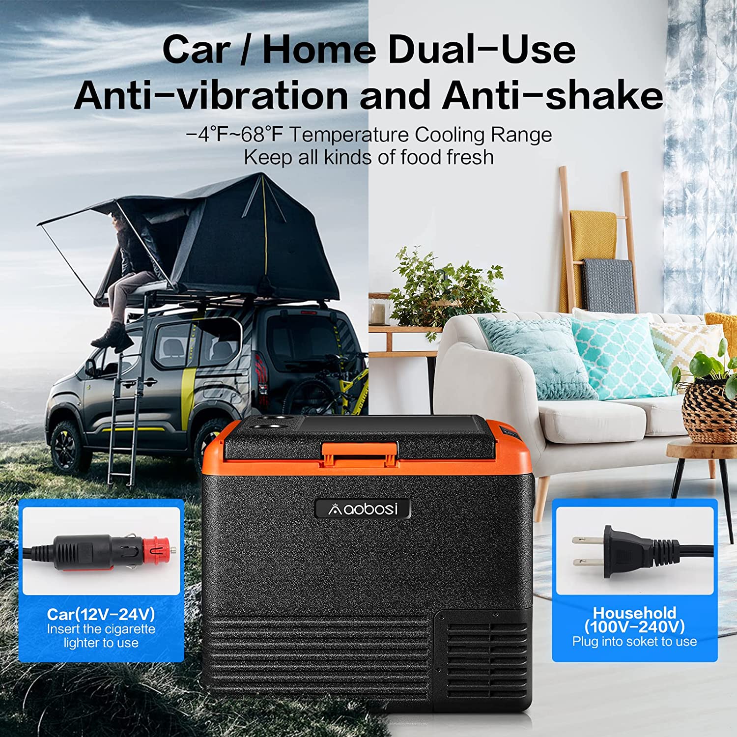 - LARGE-CAPACITY CAR REFRIGERATOR: AAOBOSI 12 volt refrigerator freezer, 53 quart/50L,it can hold 68 cans of 12oz beverage.With 120/240V AC and 12/24V DC adapters, single zone.Use for home and car. (Package includes: car refrigerator X1, cigarette lighter connectorX1 , plug adapter X1, manual X1.)Note:The product needs to sit for 6 hours before use.
