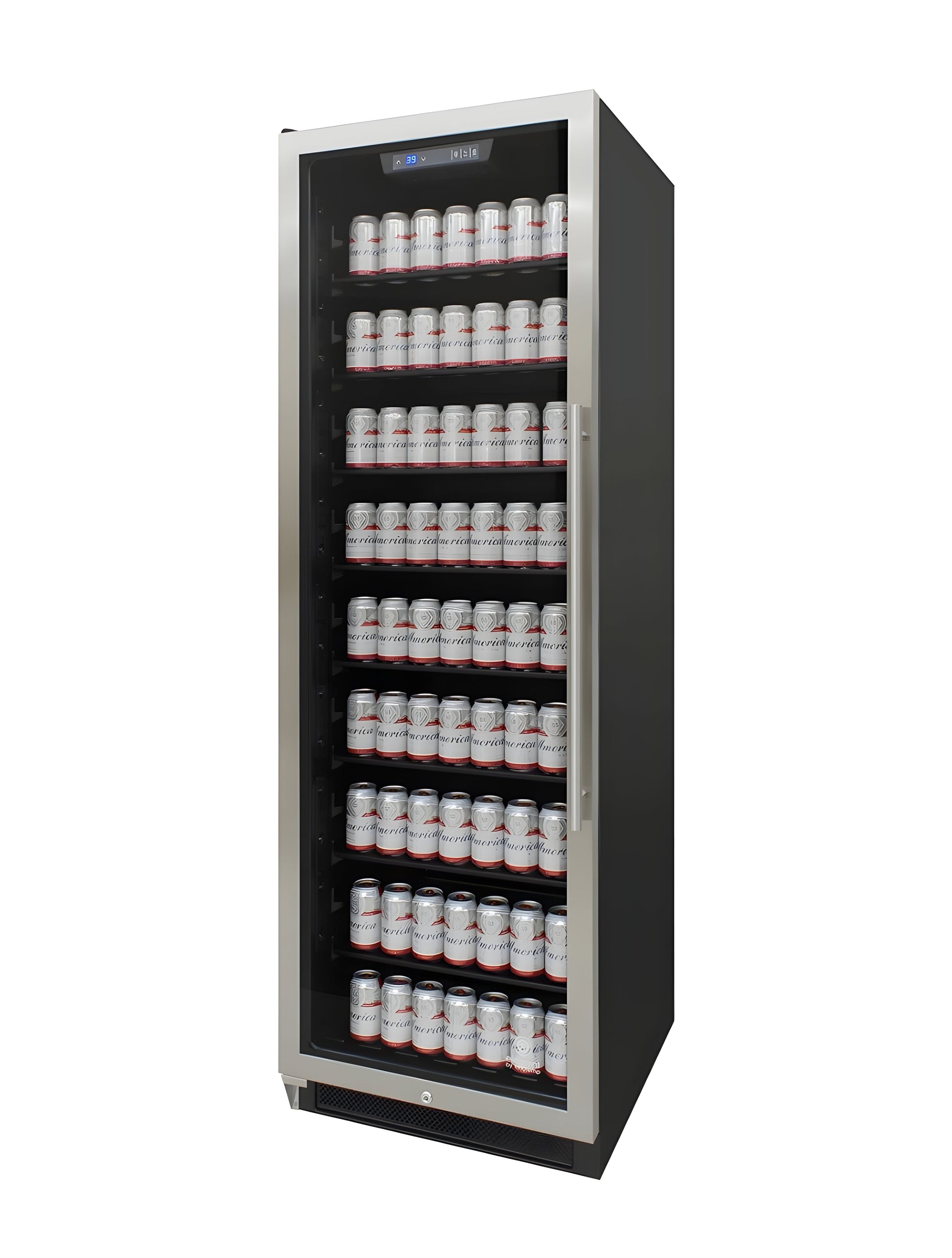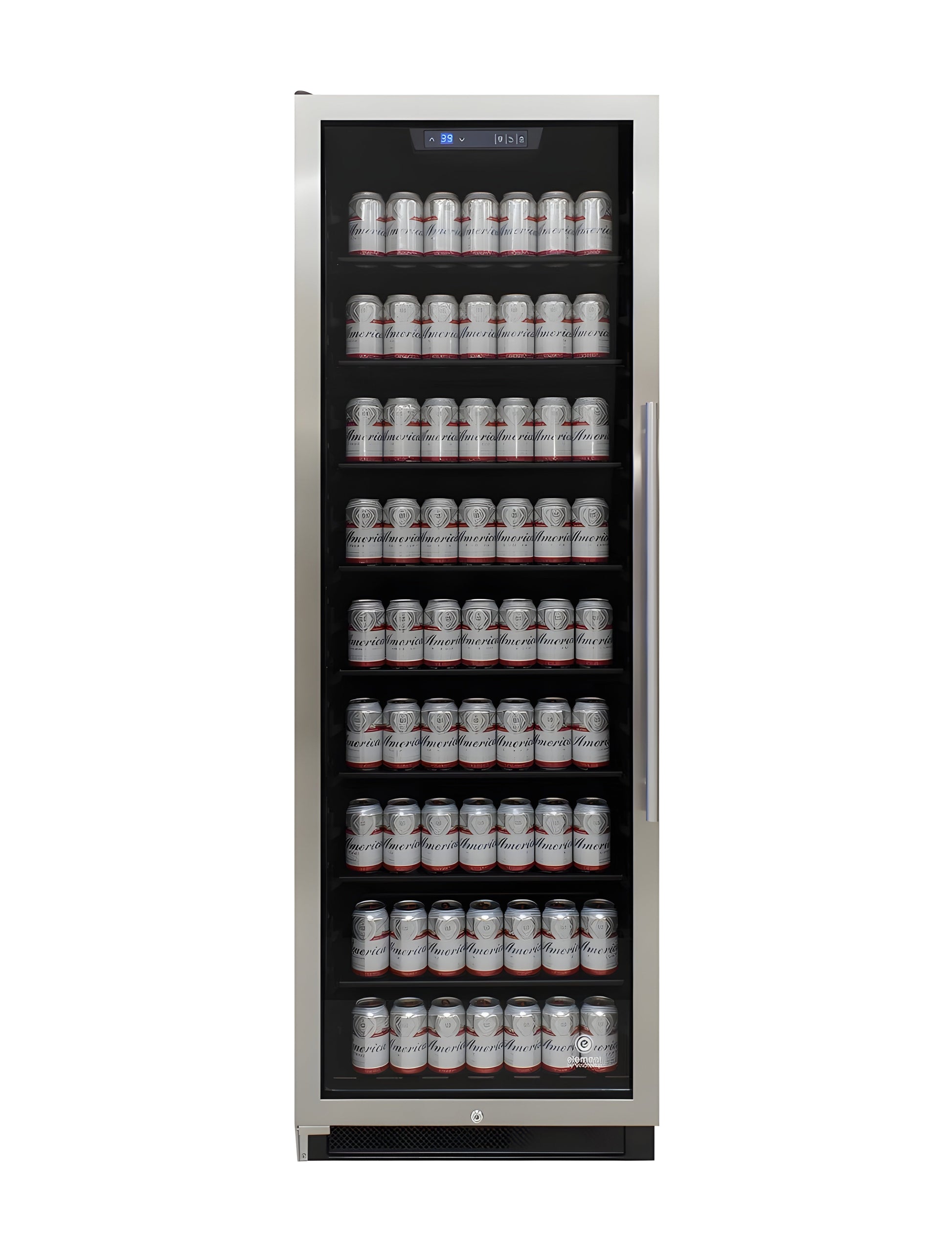 A: This high-capacity beverage cooler is designed to store up to 168 cans, featuring a single temperature zone and a left-hinge door for convenient access.