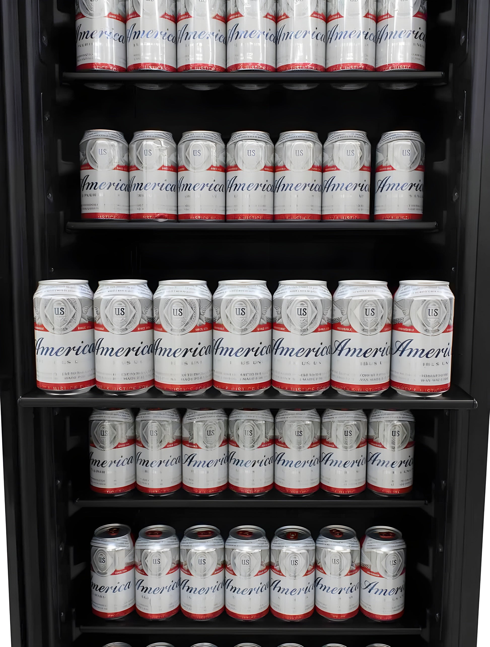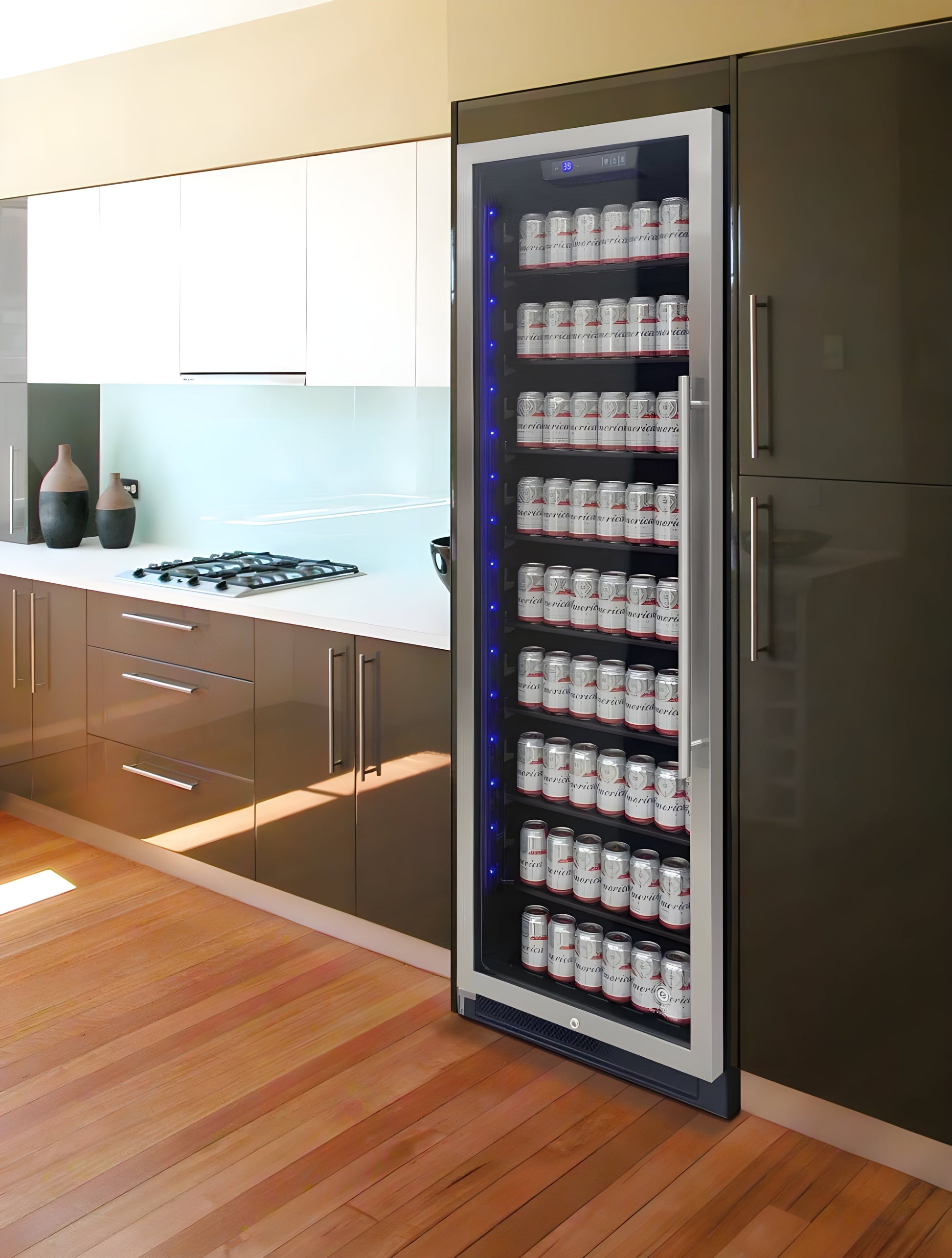 Set the right temperature for your beverages with simple digital buttons. The blue LED lighting illuminates the beverage cooler’s contents on both sides and top, while the tempered glass shelves let you display your collection of cans behind a glass door.