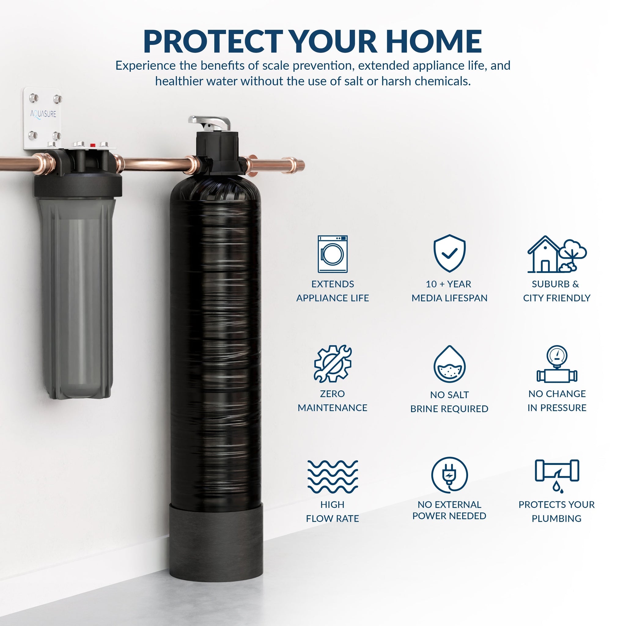 • Helps extend life of filtration system, plumbing fixtures and appliances by inhibiting scale build-up.