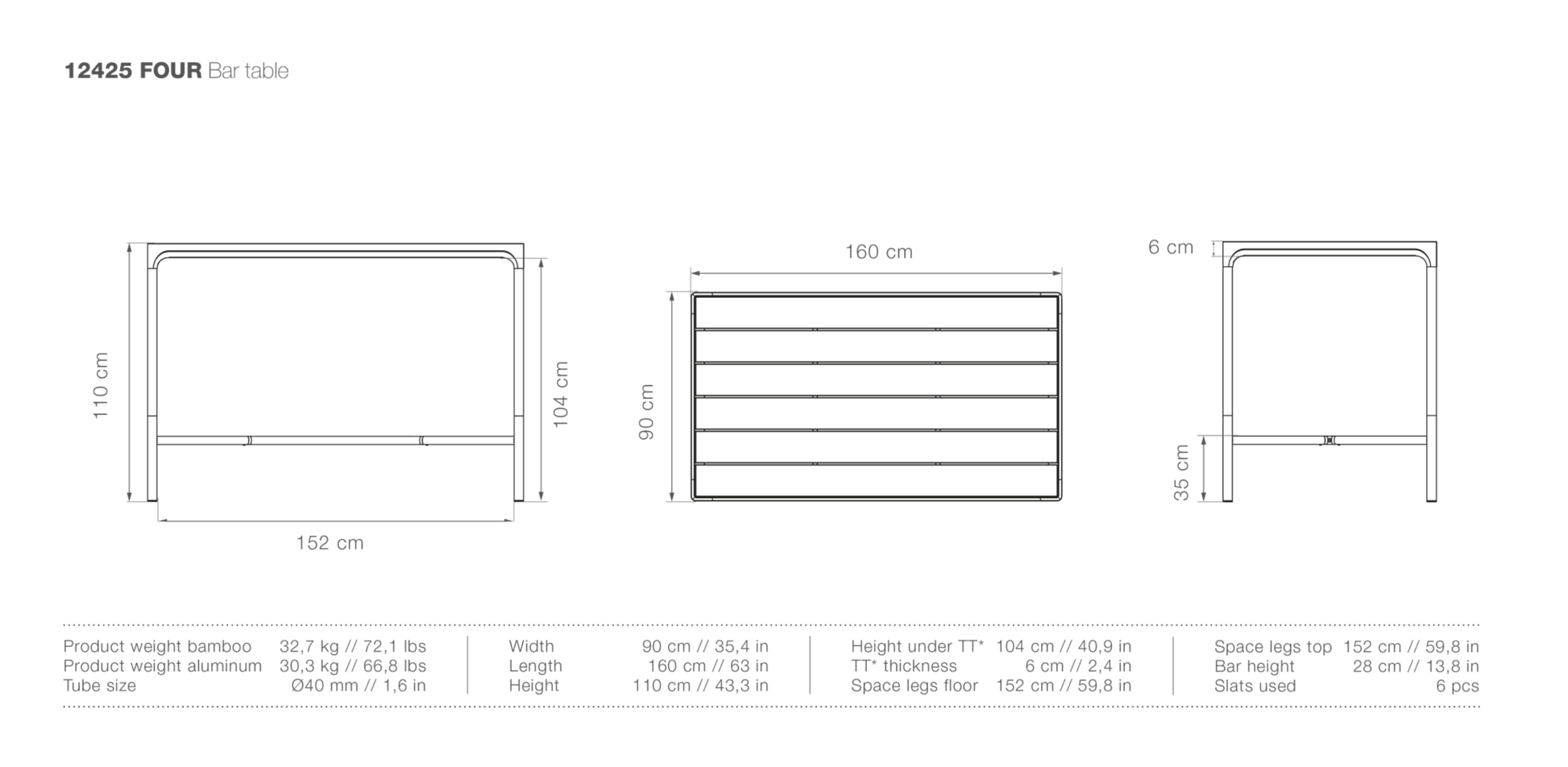 A: A modern, minimalist bar-height table designed for both indoor and outdoor use with a sleek aluminum frame.