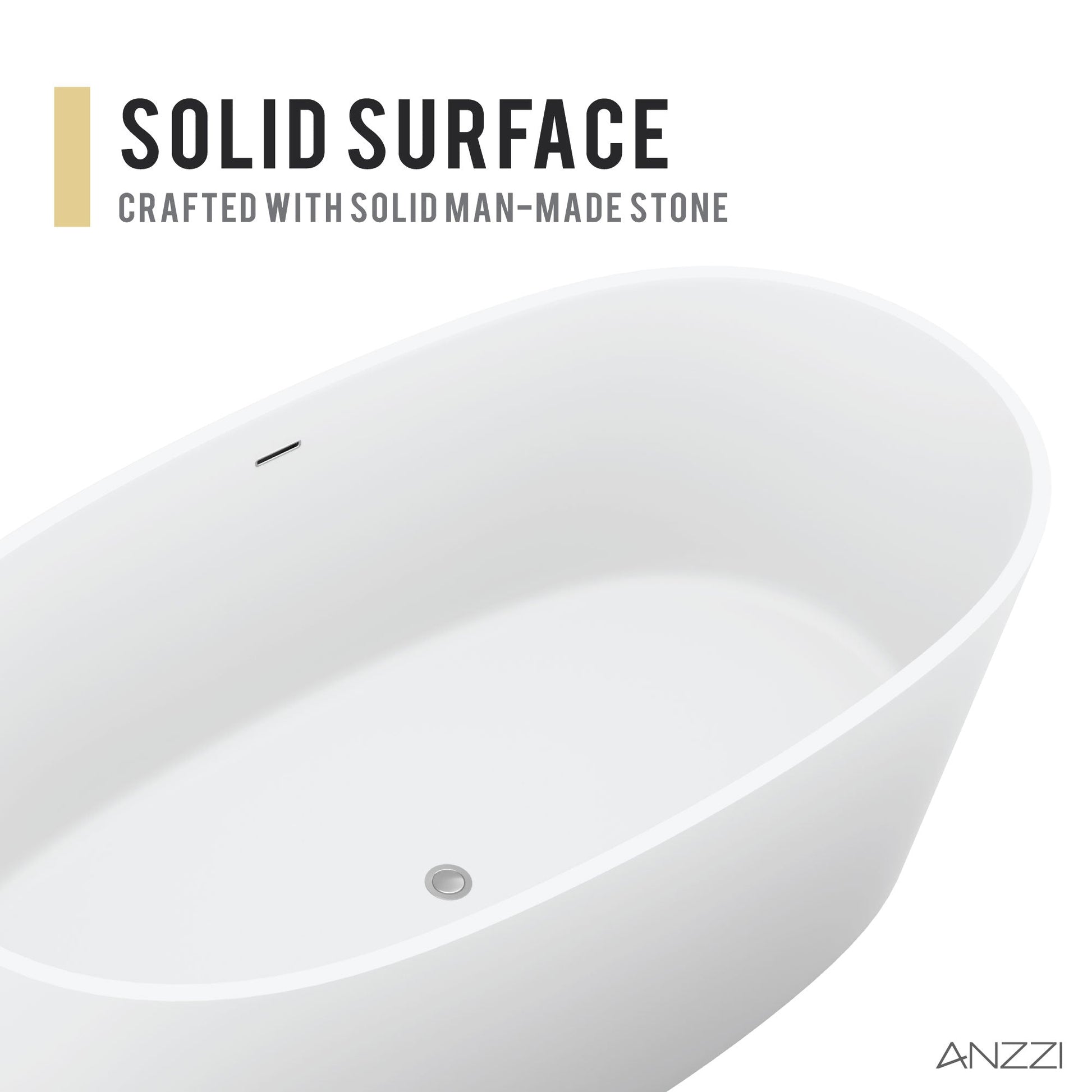 Bring an oasis home with our ANZZI Roccia Solid Surface freestanding soaking bathtub. Ergonomically oval designed to cradle the body's form for maximum comfort this tub is styled with a classic and contemporary flair. Relax and drift away while submerged in your personal spa pool.