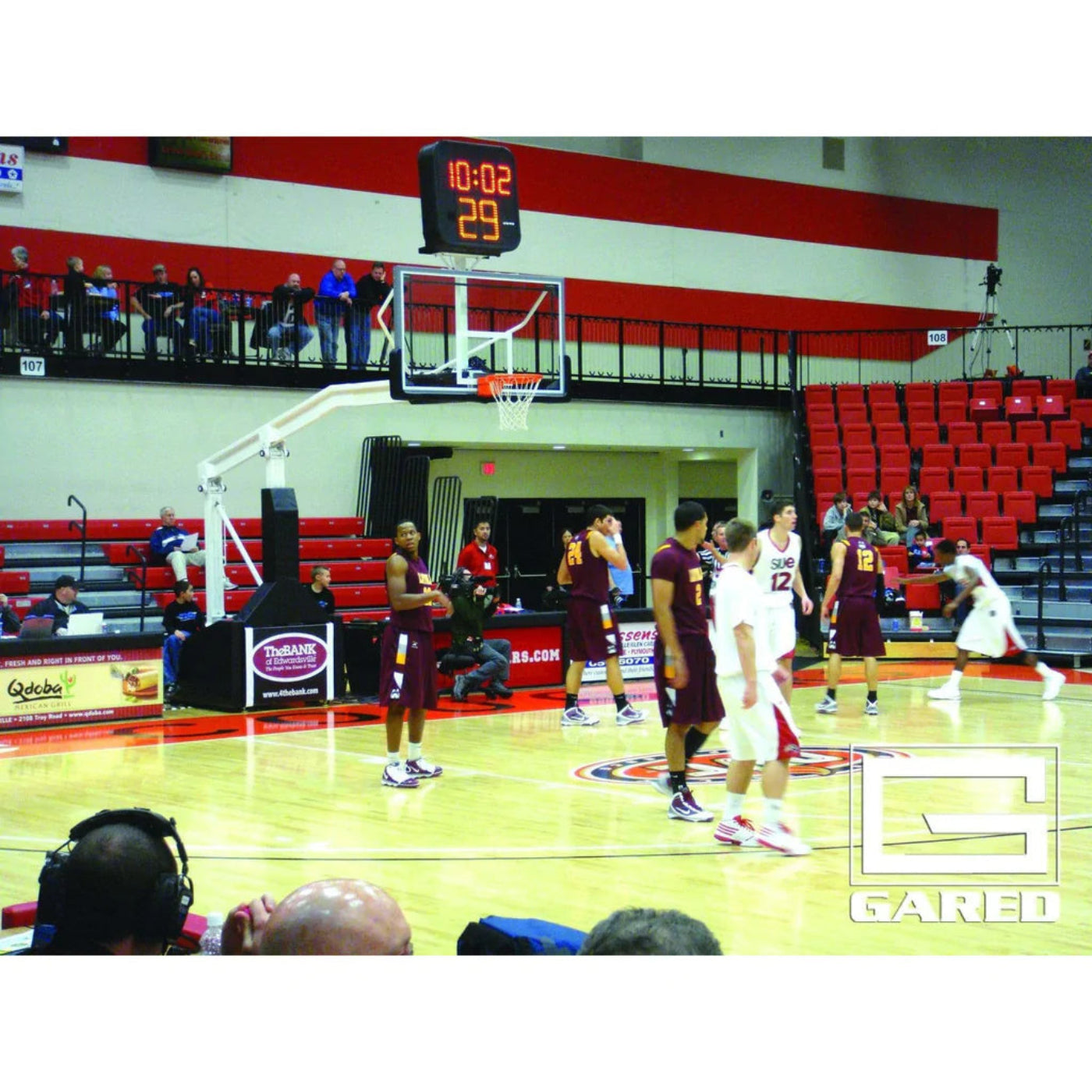 The GARED PRO S is the finest engineered competition portable in the world utilizing the GARED tension spring technology. The maintenance-free tension spring mechanism is designed for balanced and effortless lifting/lowering of the unit and is concealed inside the base for safety and appearance. A superbly designed t-shape extension arm made of fully welded, heavy wall rectangular tubing is patterned after our original GARED Pro H , which is universally considered the most structurally stable competition portable on the market. The t-shape extension arm and heavy duty uprights eliminate the need for unsightly bridge supports, giving the fans a clear view of the court. Available in 8’ and 10’ 8” boom extensions for all levels of play and adjustable to 8’, 9’, and 10’ heights. The GARED Pro S comes equipped with an official size (42” x 72”) shatter proof glass backboard, our original PRO-MOLD backboard padding, and a positive lock breakaway goal. The base is fully padded on three sides with vinyl covered 2” thick high density polyurethane foam. The front upright is similarly padded to a height of 7’ with 5” thick foam. Meets NCAA, NAIA, NFHS, and NBA main court specifications and is approved by FIBA for high level international competition. The boom pad and floor anchoring system are included with the unit. Shot clock supports are sold separately. 10 year Limited Warranty on all parts, Lifetime Limited Warranty on backboard included with the unit, 5 year Limited Warranty on PRO-MOLD pads and 4 year on a breakaway goal.