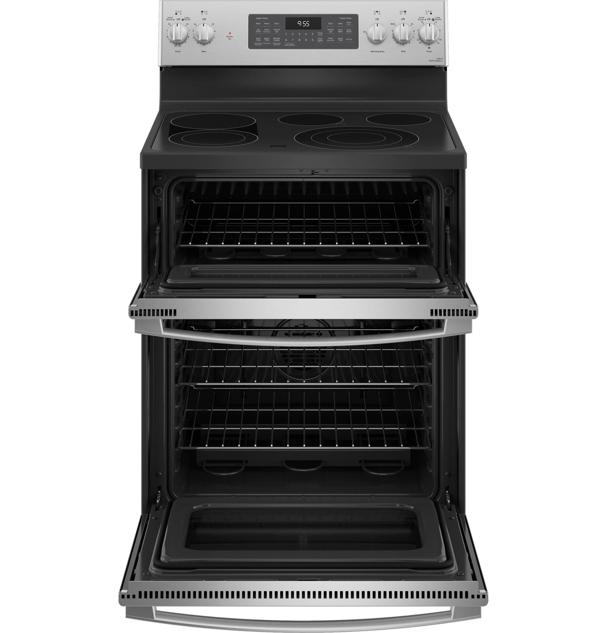 (BR)(B)No Preheat Air Fry(/B)(P)Cook healthier, crispier versions of your favorite foods in less time, thanks to an air fryer right in your oven that doesn't require preheating, a basket or a special tray(/P)(BR)(B)Built-in WiFi(/B)(P)This smart oven features built-in WiFi so you can control oven functions with the SmartHQ app on your smart device(/P)(BR)(B)Fingerprint resistant stainless(/B)(P)Easily wipe away smudges and fingerprints for a look that's always sparkling clean(/P)(BR)(B)12"/ 9"/6" Power boil element(/B)(P)A power boiler produces concentrated heat for rapid boiling in a flexible 12-inch/9-inch/6-inch burner size, so you spend less time waiting and more time cooking(/P)(BR)(B)8"/5" Dual element(/B)(P)A dual burner cooktop lets you choose between 8-inch and 5-inch electric elements for a more convenient cooking experience(/P)(BR)(B)Griddle zones(/B)(P)Create the perfect place for a griddle, grill or other large cookware with two burners that work together to create an evenly heated griddle zone right on the cooktop(/P)(BR)(B)Synchronized clocks and lights(/B)(P)Synchronize your oven and GE Appliances over-the-range microwave so that clocks are always matching and lights automatically come on when a burner is activated with Chef Connect(/P)(BR)(B)True Convection with Precise Air(/B)(P)This oven features True Convection, an advanced convection system that uses a third heating element and reversing fan for the highest level of heat and air circulation(/P)(BR)(B)Fast preheat(/B)(P)Preheat the oven quickly and cut down on preheat time with a speedy preheat feature(/P)(BR)(B)Fifth element warming zone(/B)(P)A convenient low-heat warming zone provides even temperature control for foods on the cooktop(/P)(BR)(B)Self-clean with steam clean(/B)(P)This self-cleaning oven uses optional steam cleaning for light soils to clean the oven cavity with less heat and odor(/P)(BR)(B)Hidden baking element(/B)(P)This oven features a hidden baking element that gets rid of hard-to-reach areas and makes cleanup easier(/P)(BR)(B)Black gloss oven interior(/B)(P)A clean and sleek interior that is attractive and easy to maintain(/P)(BR)(B)Large capacity double oven(/B)(P)Cook an entire meal at once with a 6.6 cubic foot total capacity double oven which provides enough room for multiple dishes(/P)