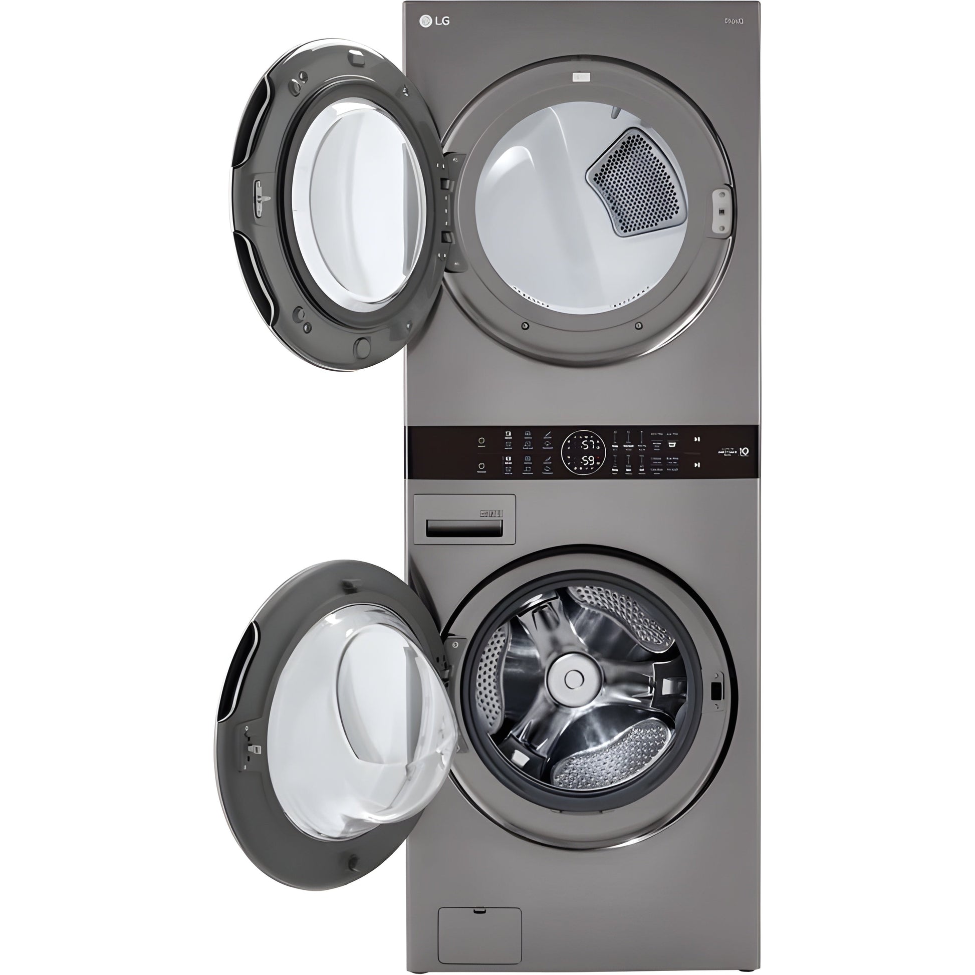 A: The LG WashTower combines a 4.5-cu. ft. front load washer and a 7.4-cu. ft. gas dryer in a compact vertical design with an intuitive center control panel, providing efficient, space-saving laundry care for your home.
