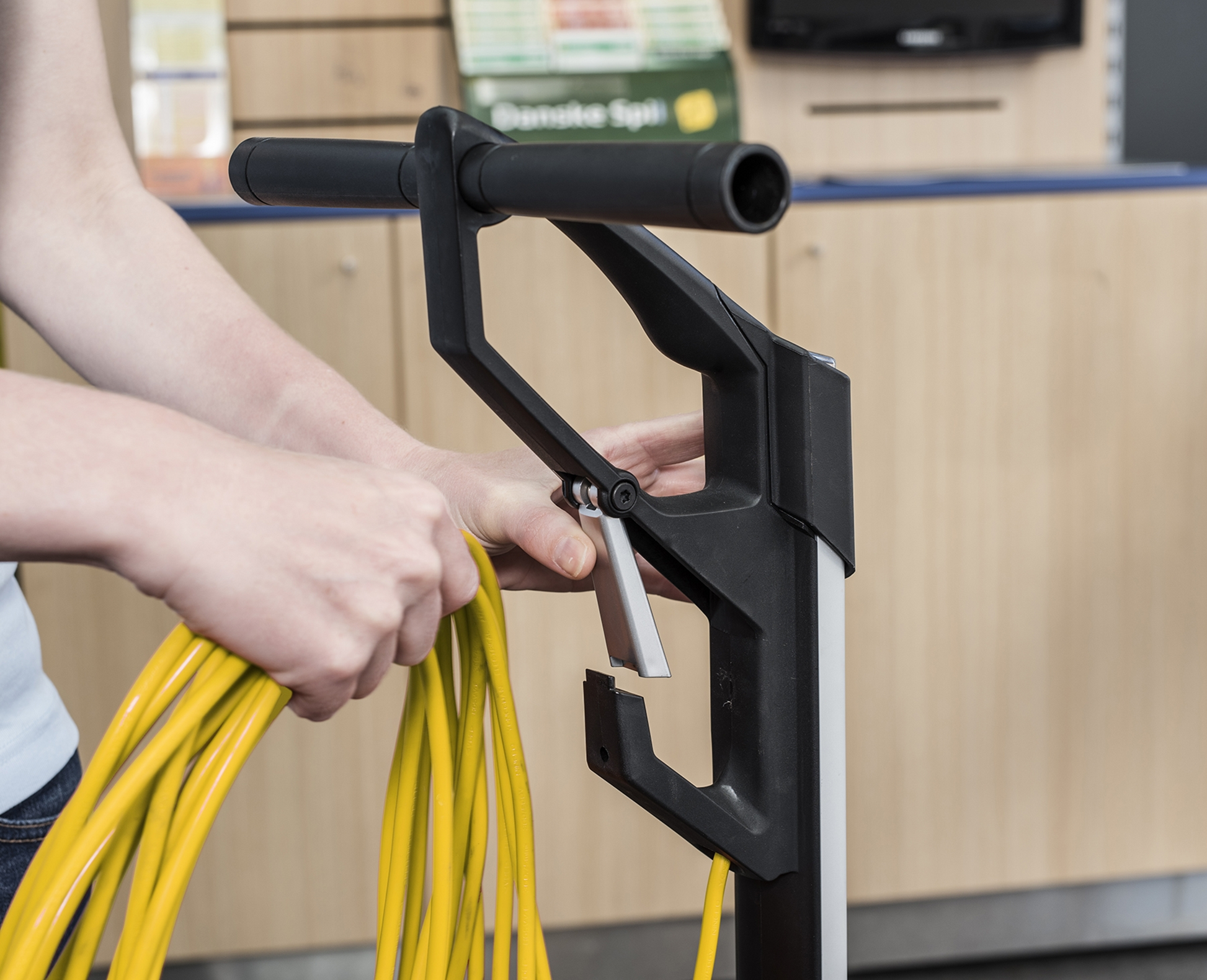 The SC100™ has a cleaning clearance of under 4 inches. Machine functions stop when in the upright position. Solution tank dispenses only clean solution, unlike a traditional mop-and-bucket. |