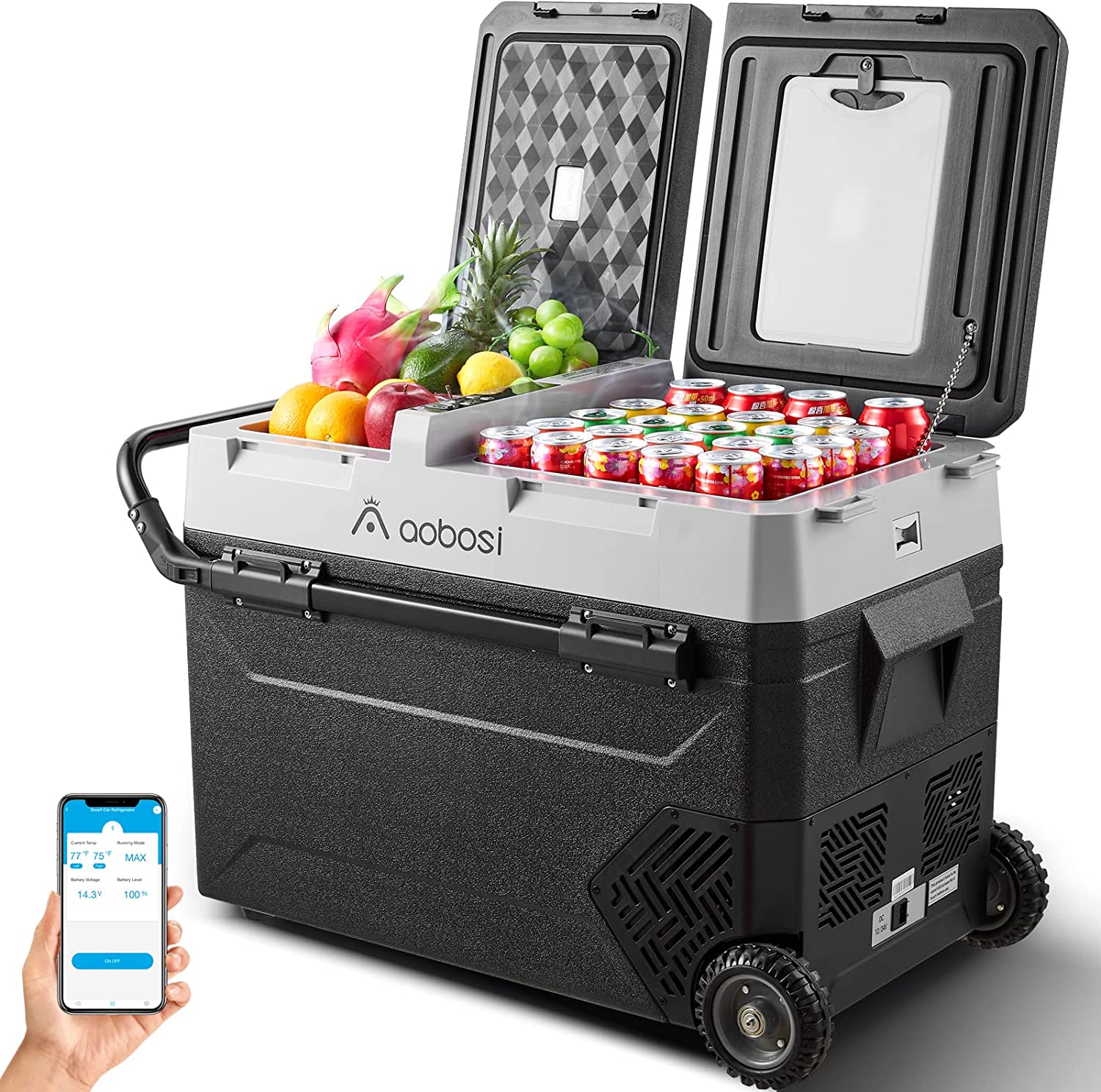 - APP CONTROL AND DUAL ZONE CAR FRIDGEAOBOSI compressor car refrigerator enjoys a large 60 quart capacity, the best companion for short trips, storing up enough drinks and food for your road trip. Two zones of car refrigerator can be independently controlled for temperature. It's up to you to decide which side to use as the freezer zone or fridge zone. Our portable car freezer support App or manual control. (For android and ios)
