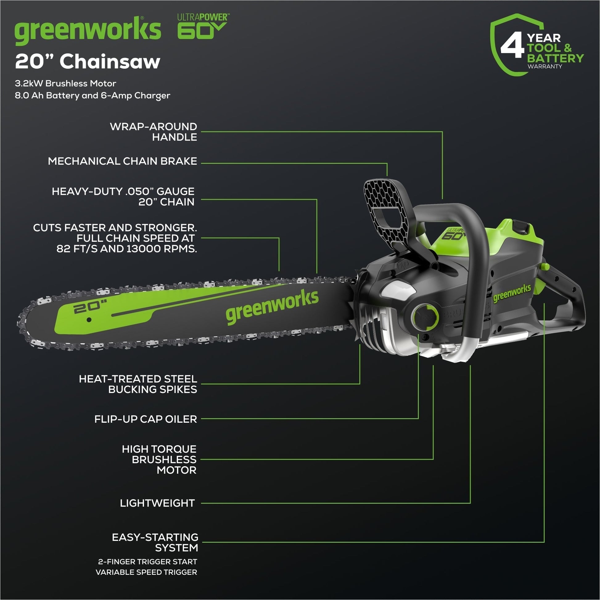 Greenworks 60V 20" Cordless Battery 3.2kW Chainsaw w/ 8.0Ah Battery & Rapid Charger - 2026202