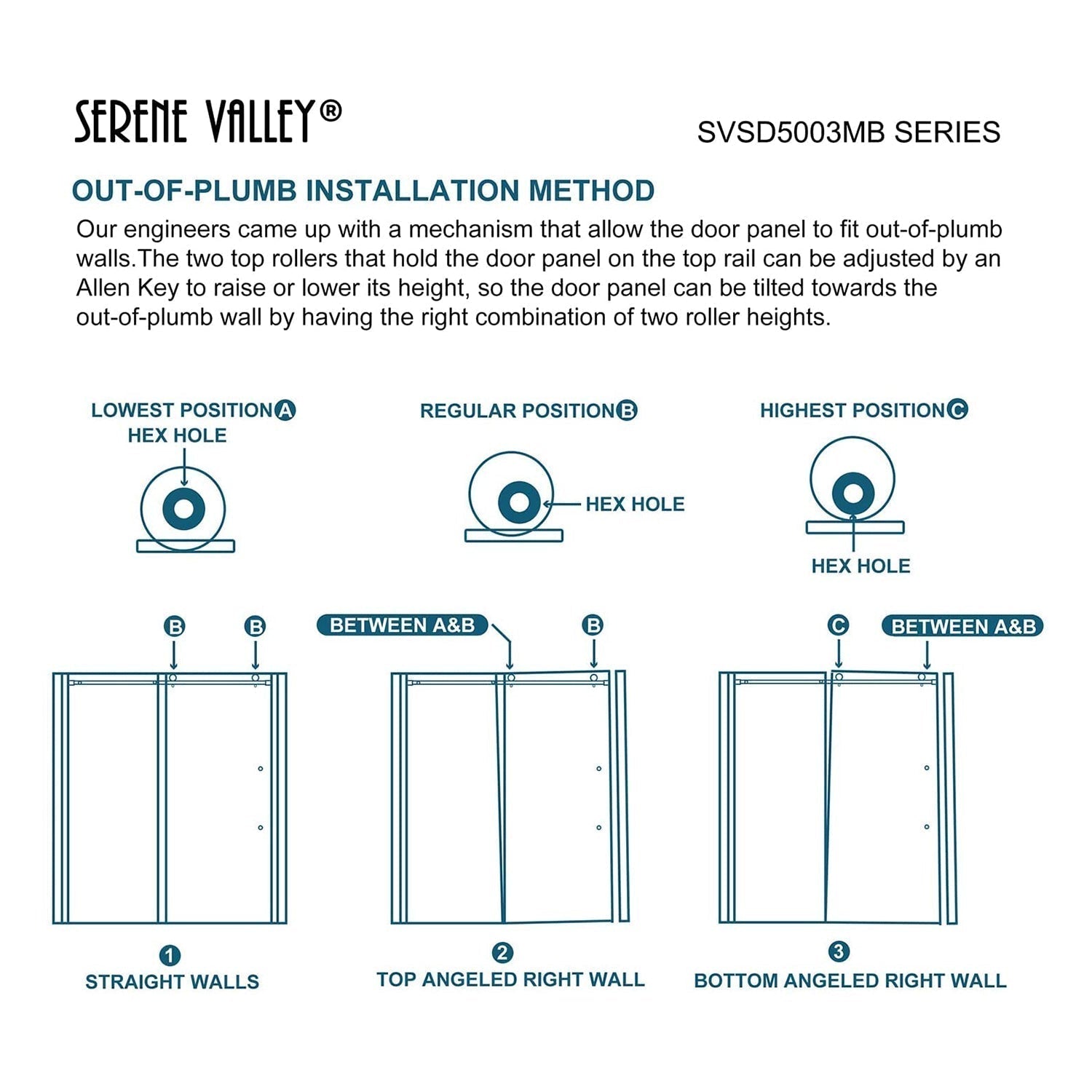 - Rollers can be mounted on the door panel and adjusted up and down, allowing for a slight horizontal tilt to fit out-of-plumb walls