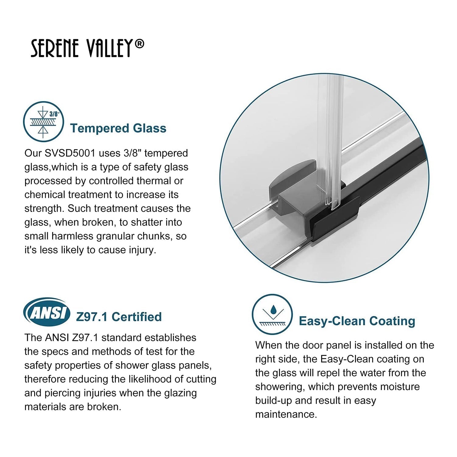 Q: What are the key features of the Serene Valley 60 x 74 Inch Big Roller Frameless Sliding Shower Door in Matte Black?