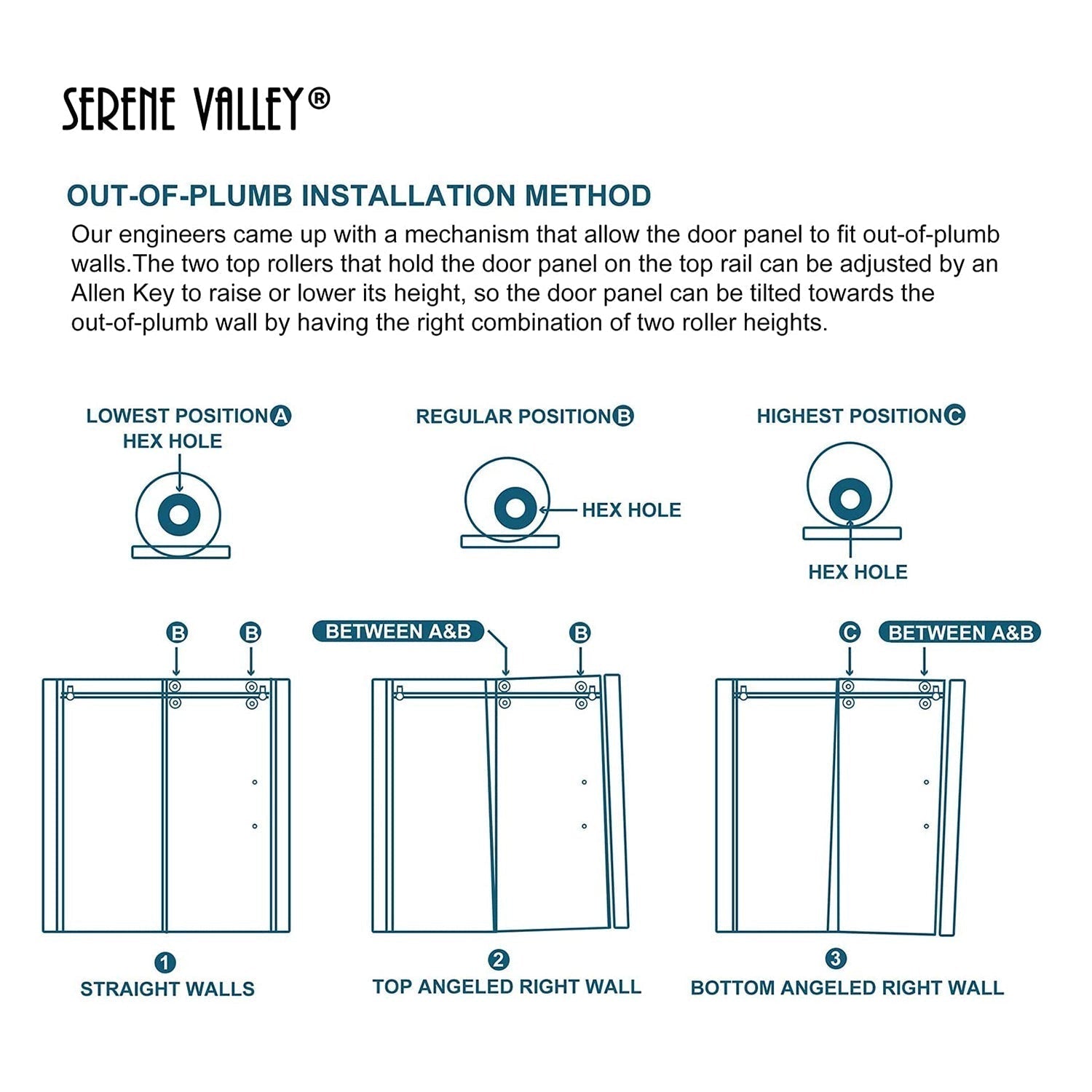 The shower door features an adjustable width from 56 to 60 inches wide and measures 74 inches high. Shower with confidence and ease with the 60 x 74 Inch Big Roller Sliding Shower Door from Serene Valley.