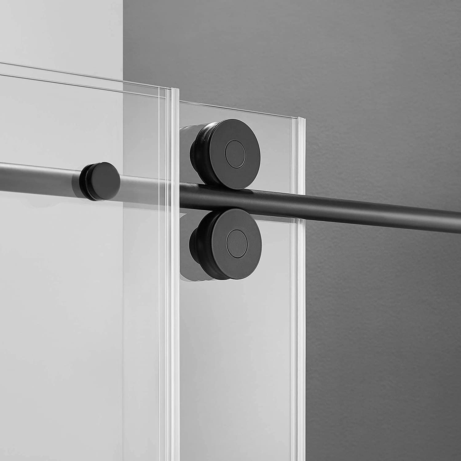 A: This shower door features a sleek frameless design with a stylish matte black finish. It includes 3/8-inch thick tempered safety glass and four heavy-duty 3-inch rollers for smooth and stable sliding. The adjustable width ranges from 56 to 60 inches, with a height of 74 inches, providing a spacious and modern look.