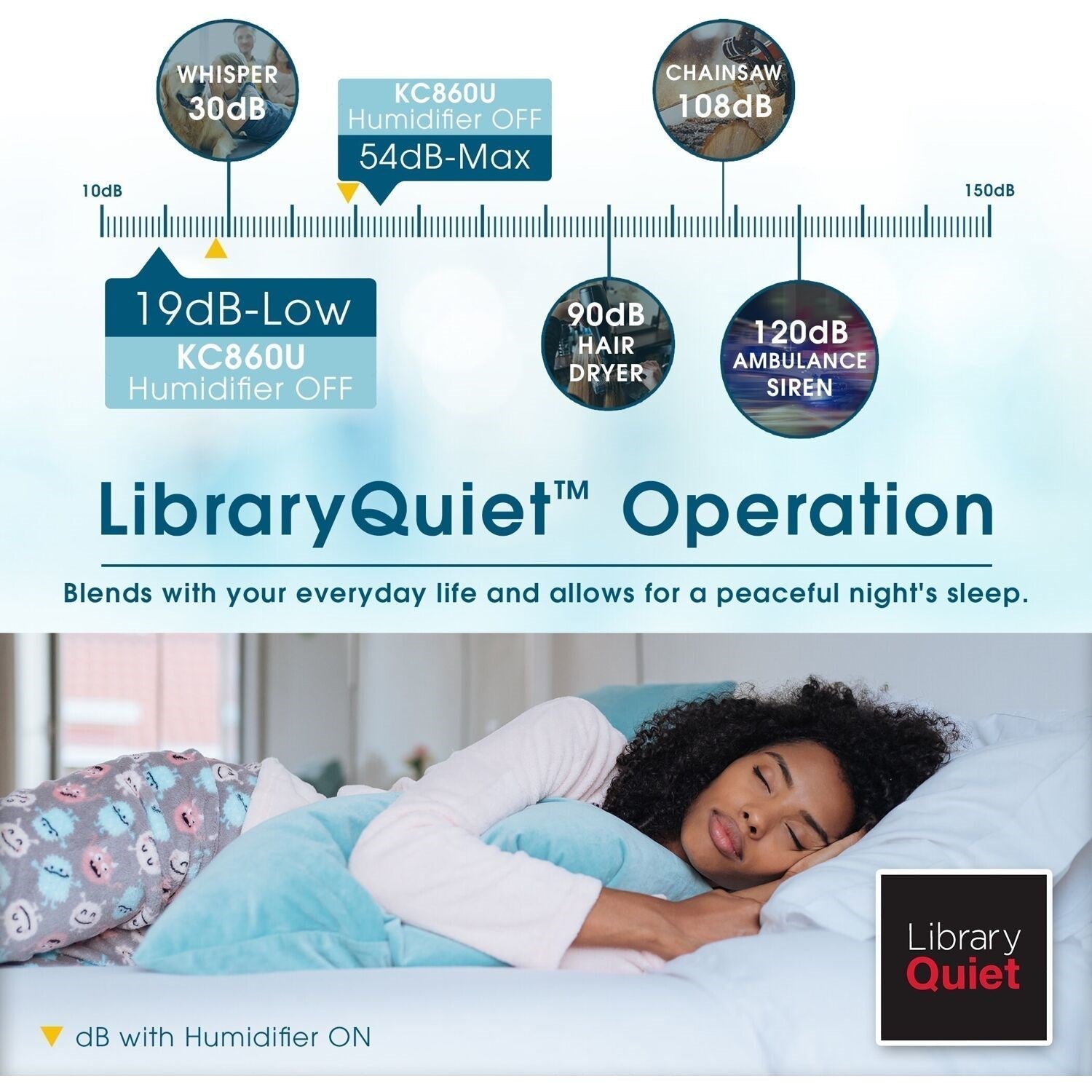 - Library Quiet operation is ideal for bedrooms and living rooms. Silent Mode is as quiet as 19 decibels, about the volume of rustling leaves.