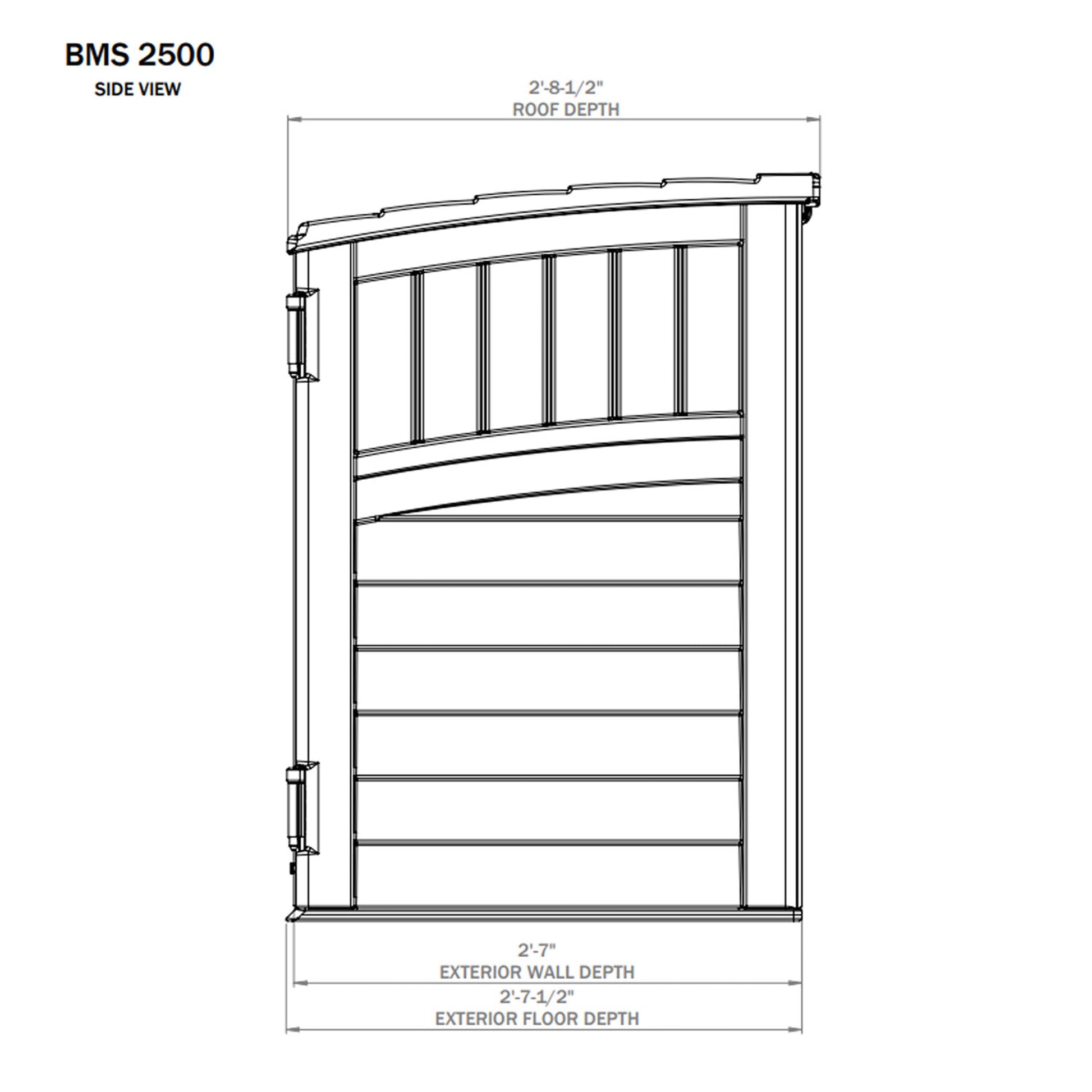 A: Each shed measures 53 inches long, 31.5 inches wide, and 45.5 inches high, providing compact yet efficient storage.