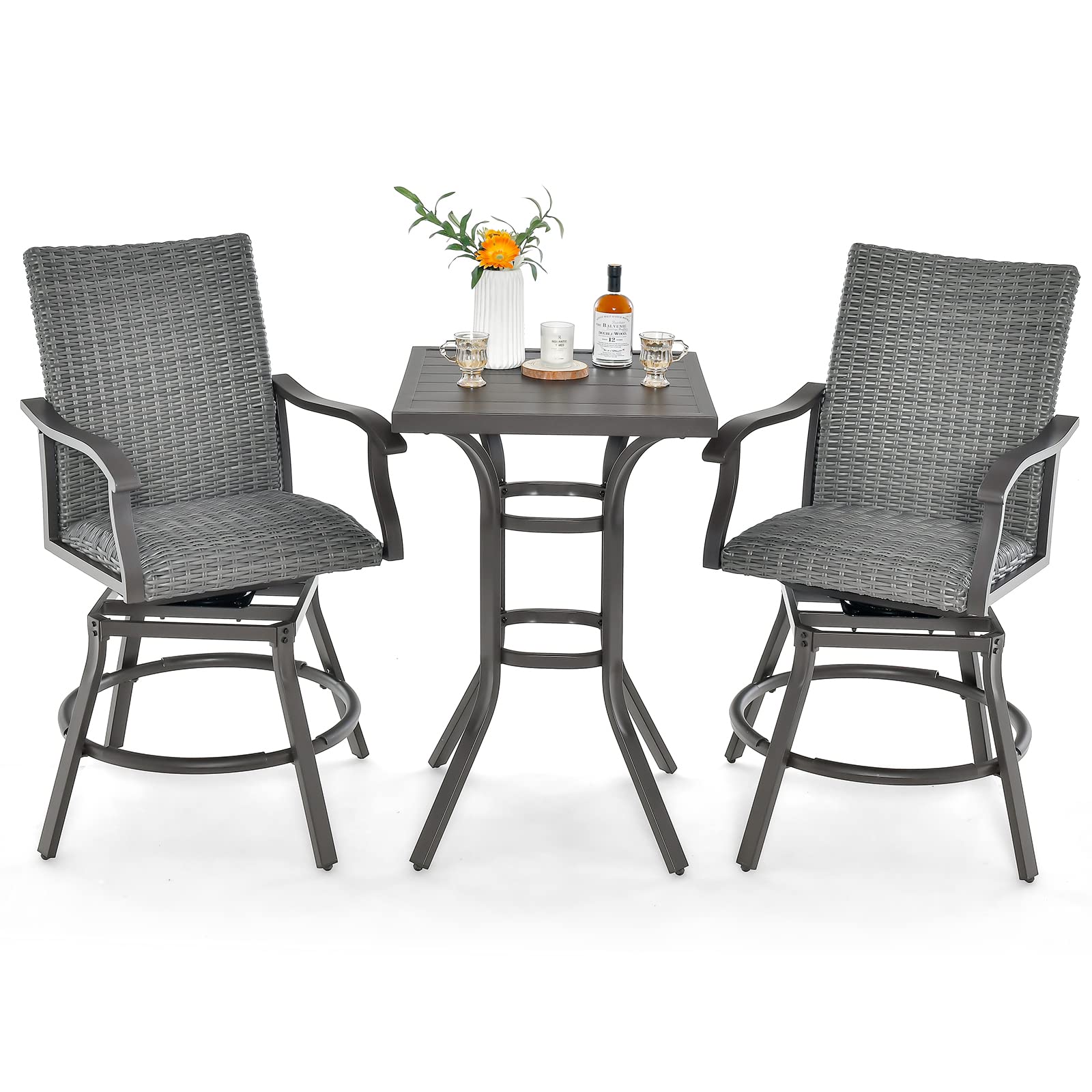 A: The set includes two swivel bar stools and one bar-height table, designed for both comfort and style in outdoor or indoor settings.