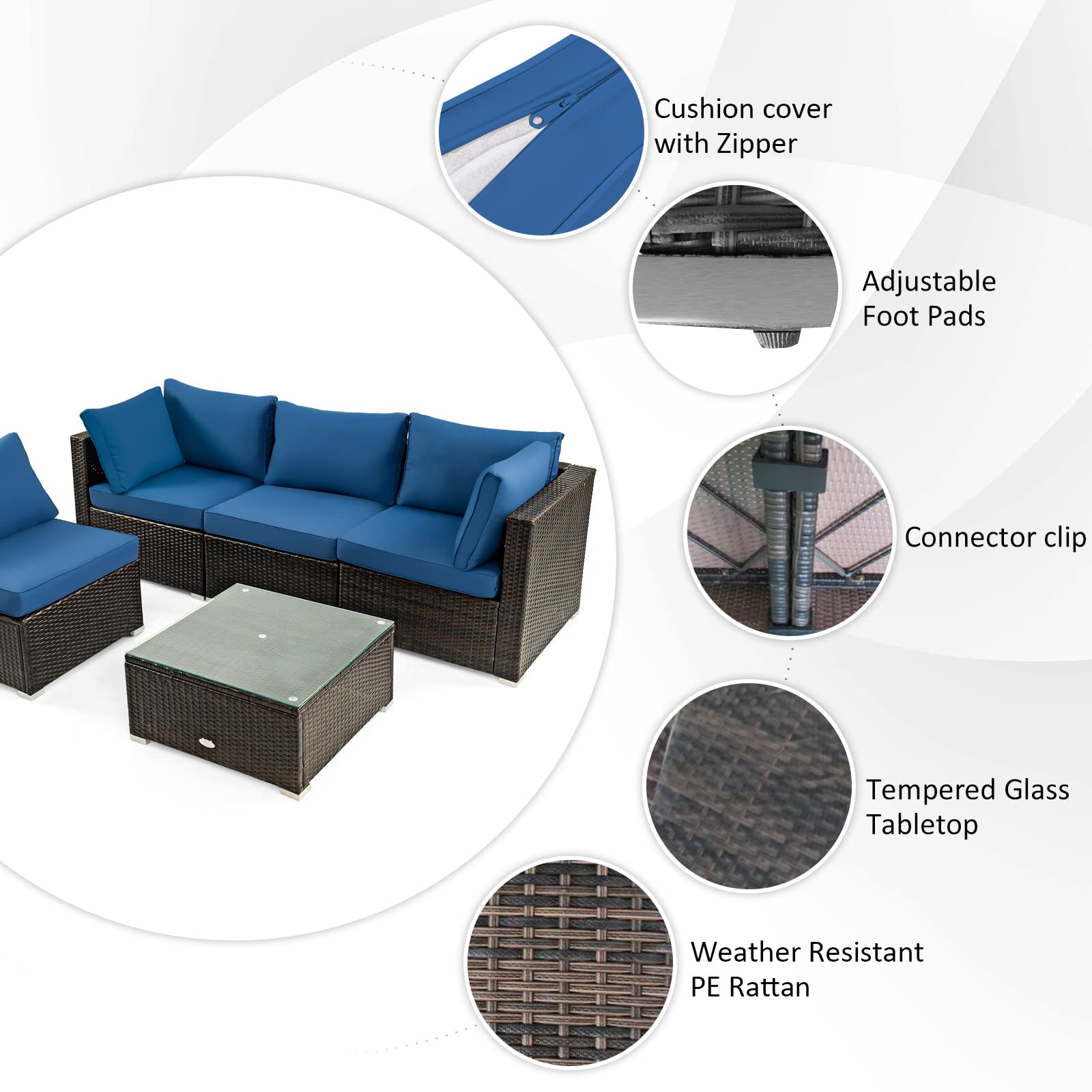 Material: PE Rattan, Steel, Tempered Glass, Polyester, Sponge, PVC, Ore Powder, Stainless Steel