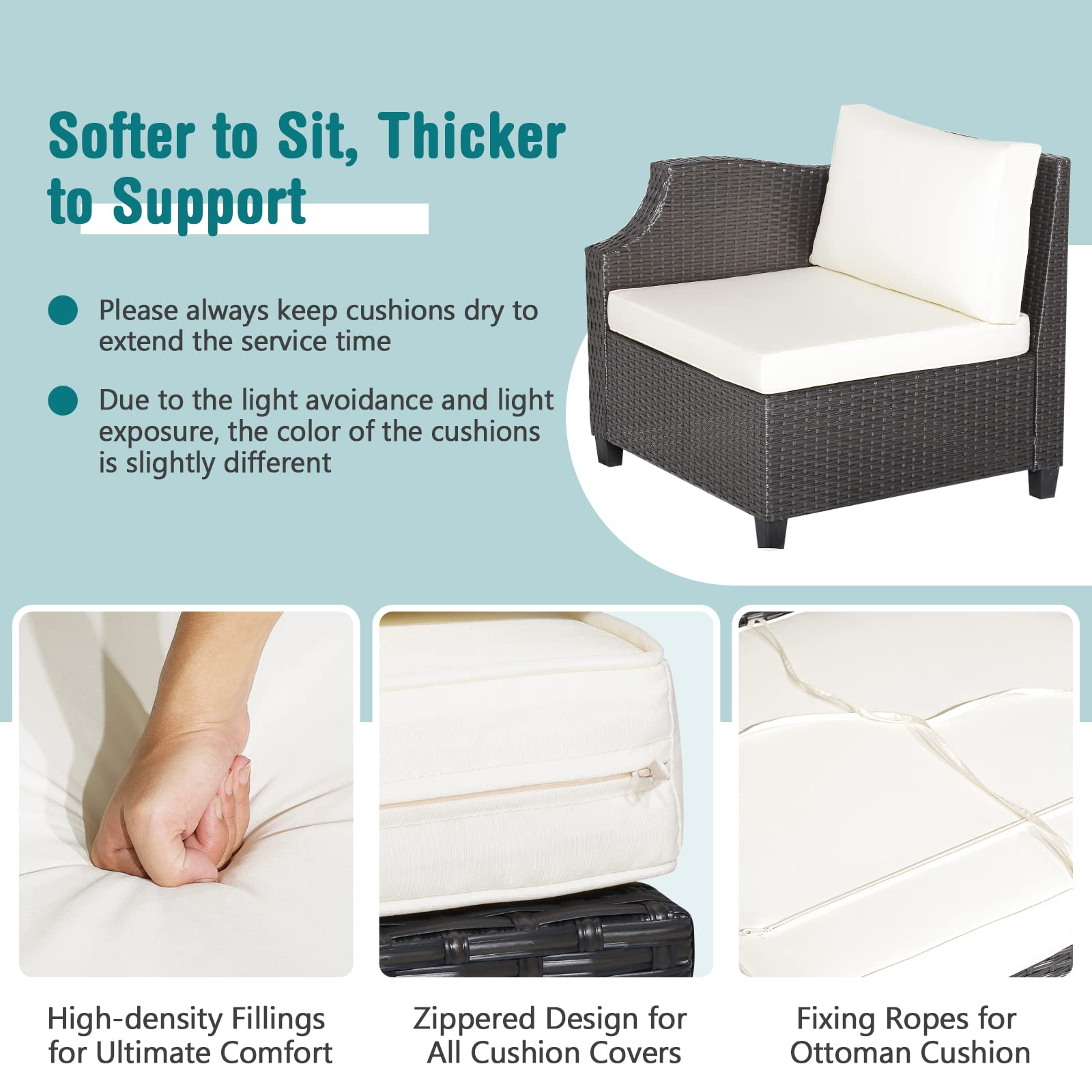 Using fade-resistant hand-woven PE wicker, rustproof metal frame, and solid acacia wood as the main materials, this outdoor conversation set will show you higher durability and stronger stability for a longer service time. When you sit on the sofa and put your legs on the ottoman, you will always feel comfortable thanks to its soft padded cushions. If you need more storage space and a functional table, just put the coffee table and ottoman together, transforming them into a height-adjustable table that not only provides you with extra stable space but allows you to adjust the height into 16" or 25" Furthermore, you can open the storage box with a safe pneumatic rod and put all seat cushions in. The waterproof liner will protect them from rain.