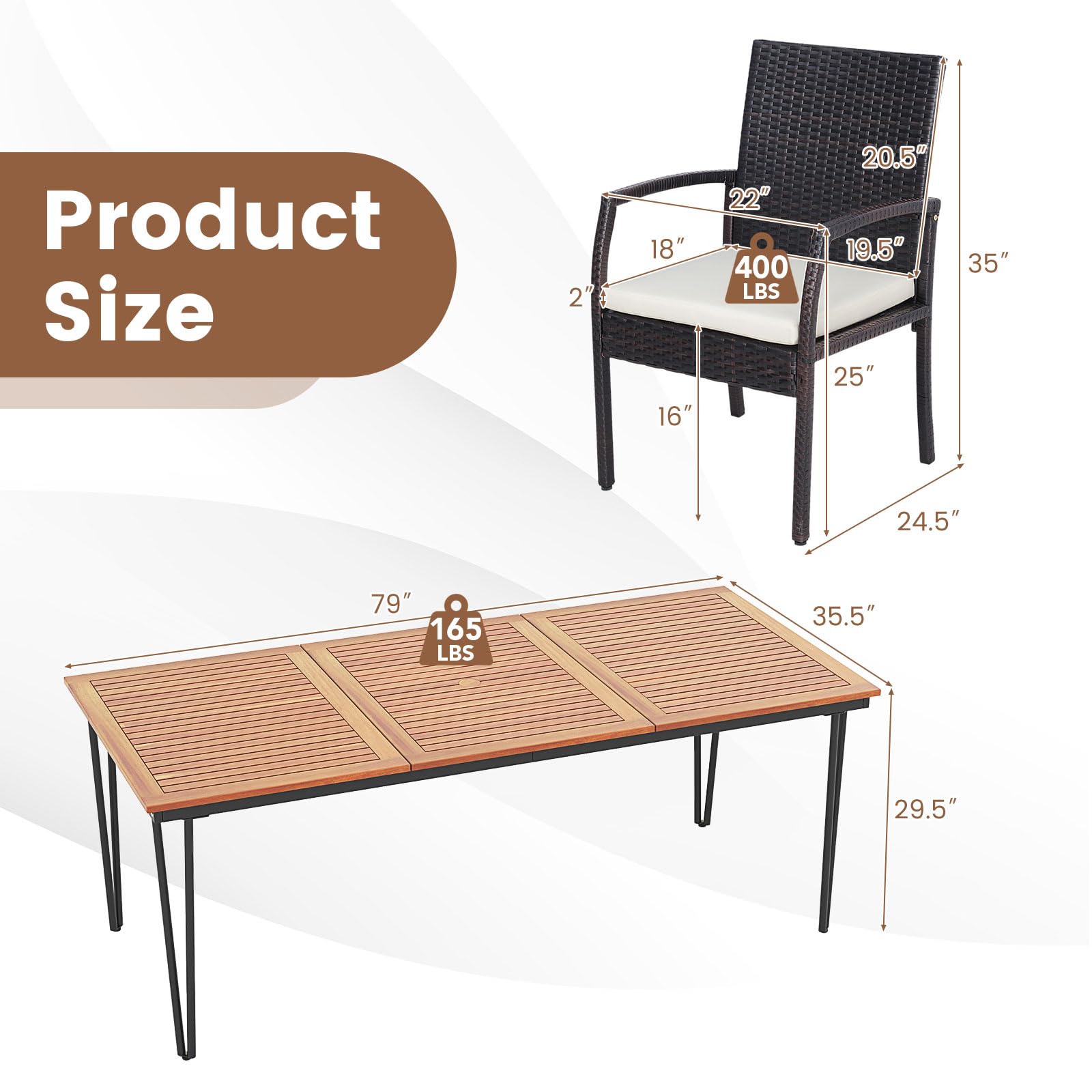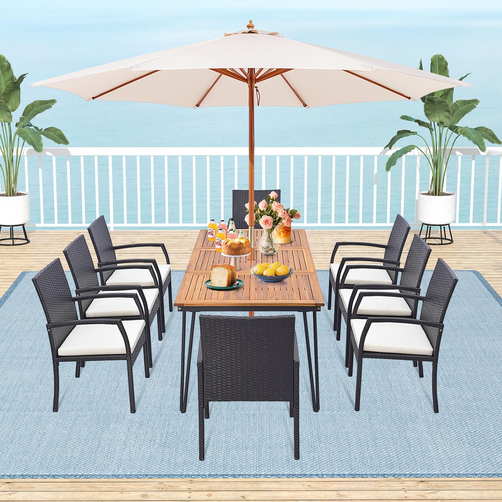 Crafted from solid acacia wood, fade-resistant PE rattan and heavy-duty metal frame, this patio table and chairs set ensures better outdoor performance while making your space look more beautiful. This rectangular dining table with a 1.9” umbrella hole not only creates sufficient space to hold different food but also allows you to add a patio umbrella (not included) for a cozy shade. Besides, the ergonomic rattan chairs feature soft cushions, providing you with a comfortable sitting experience. To maximize your outdoor space, you can tuck 6 chairs under the table.