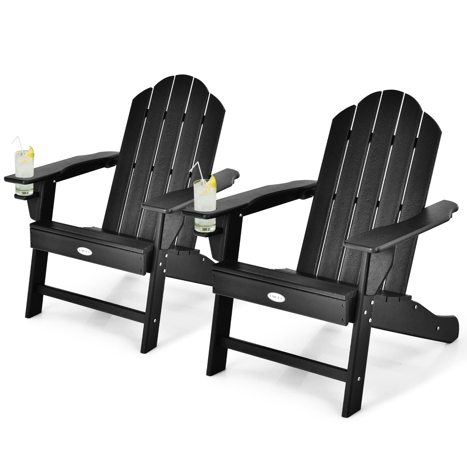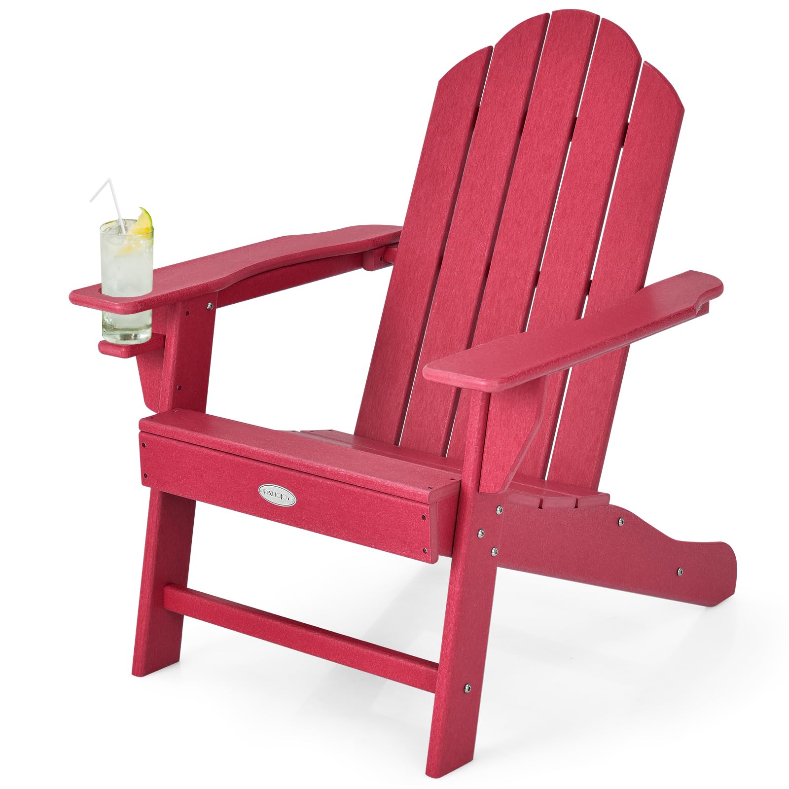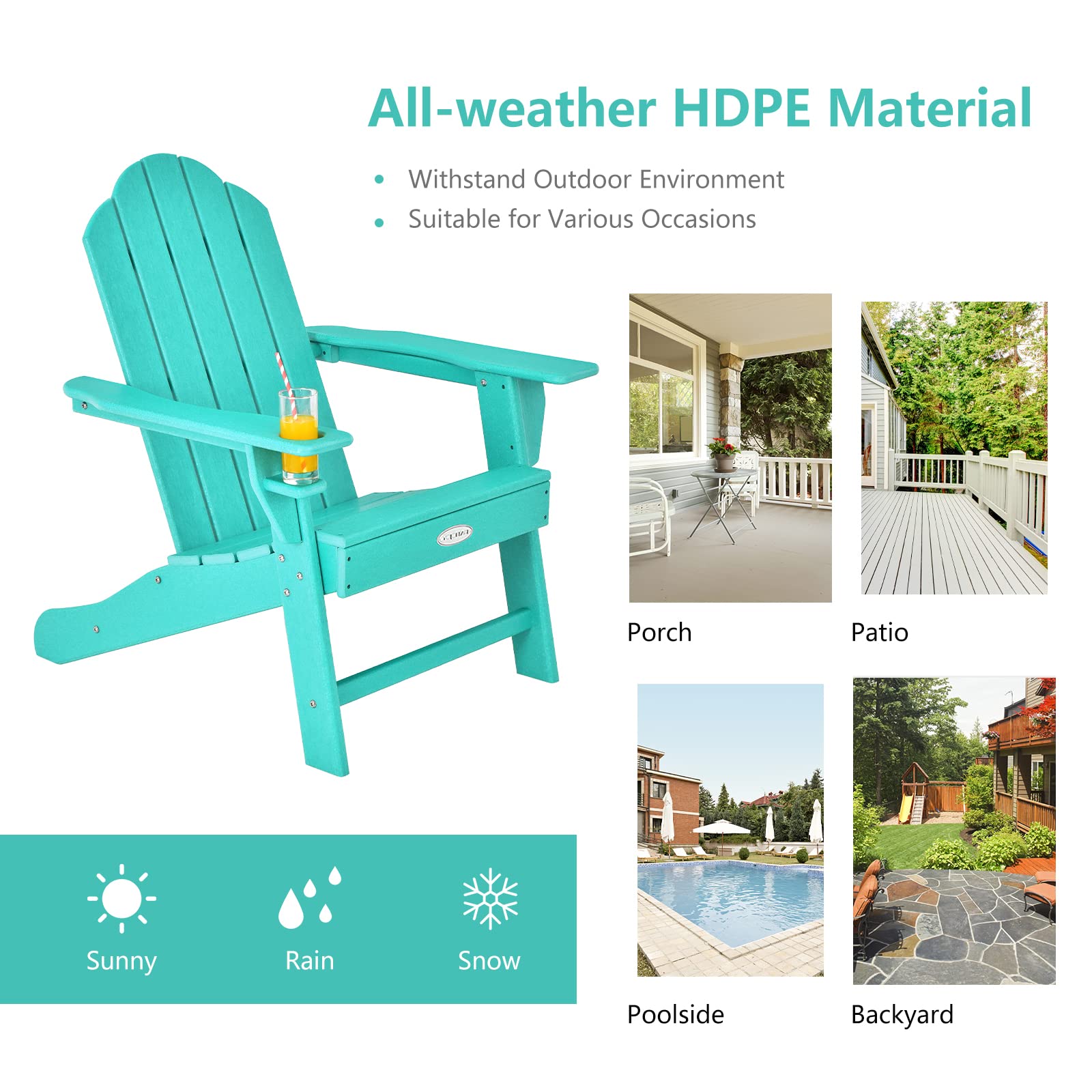 By sitting on the ergonomic patio chair with a 103-degree reclined backrest, wide armrest, and oversized seat, you will get a cozy sitting experience while relieving your fatigue. And the handy cup holder brings great convenience to hold your drinks. In order to enhance the outdoor ability of this Adirondack chair, it is made of weather-resistant HDPE material and connected by 304 stainless steel screws to fit the outdoor environment for durability. Likewise, the sturdy construction with a reinforced triangular structure is built for stability. A simple assembly is required.