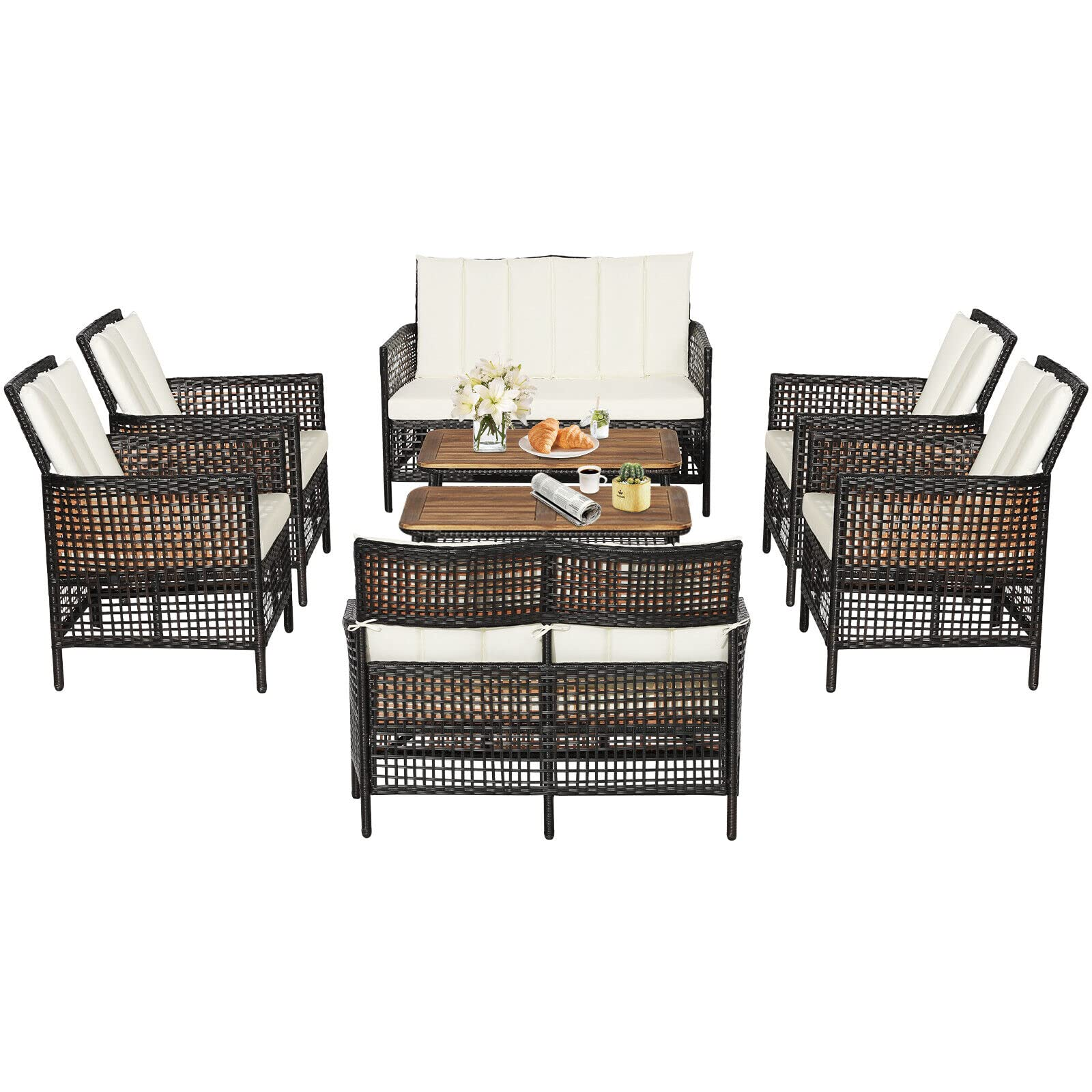 Featuring ergonomic armrests, softly padded back, and seat cushions, this outdoor conversation set brings extraordinary comfort so that you can use this cozy patio set to entertain your friends and guests. Additionally, the rectangular coffee table provides sufficient storage space thanks to the large acacia wood tabletop and extra open shelf. What??s more, no matter where you put this outdoor furniture set, it will always fit because it comes with multiple combinations to match your outdoor places. And the weather-resistant PE rattan and rustproof steel frame make this outdoor sofa set durable and stable for long-time outdoor use.