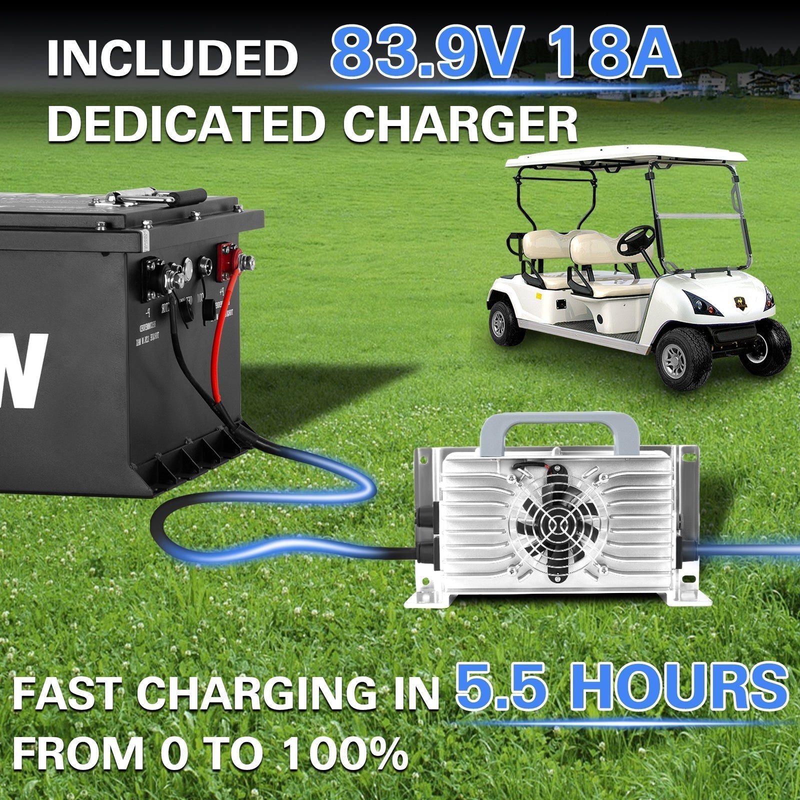 The included 83.9V 18A charger recharges the battery quickly, reducing downtime and keeping your golf cart powered and ready when you need it most.