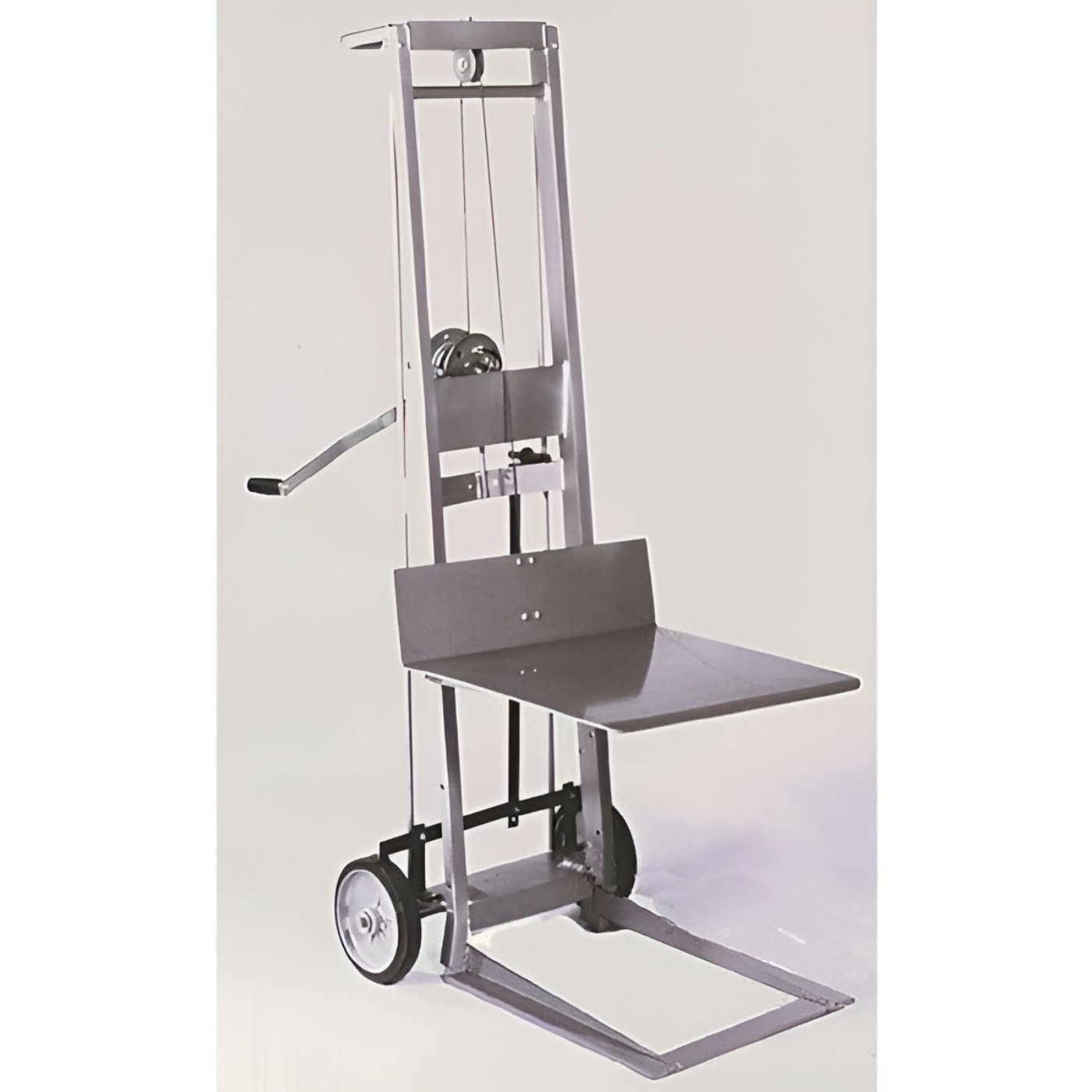 A: It features a two-wheeled design for easy maneuverability and a hand-operated winch for controlled lifting and lowering.