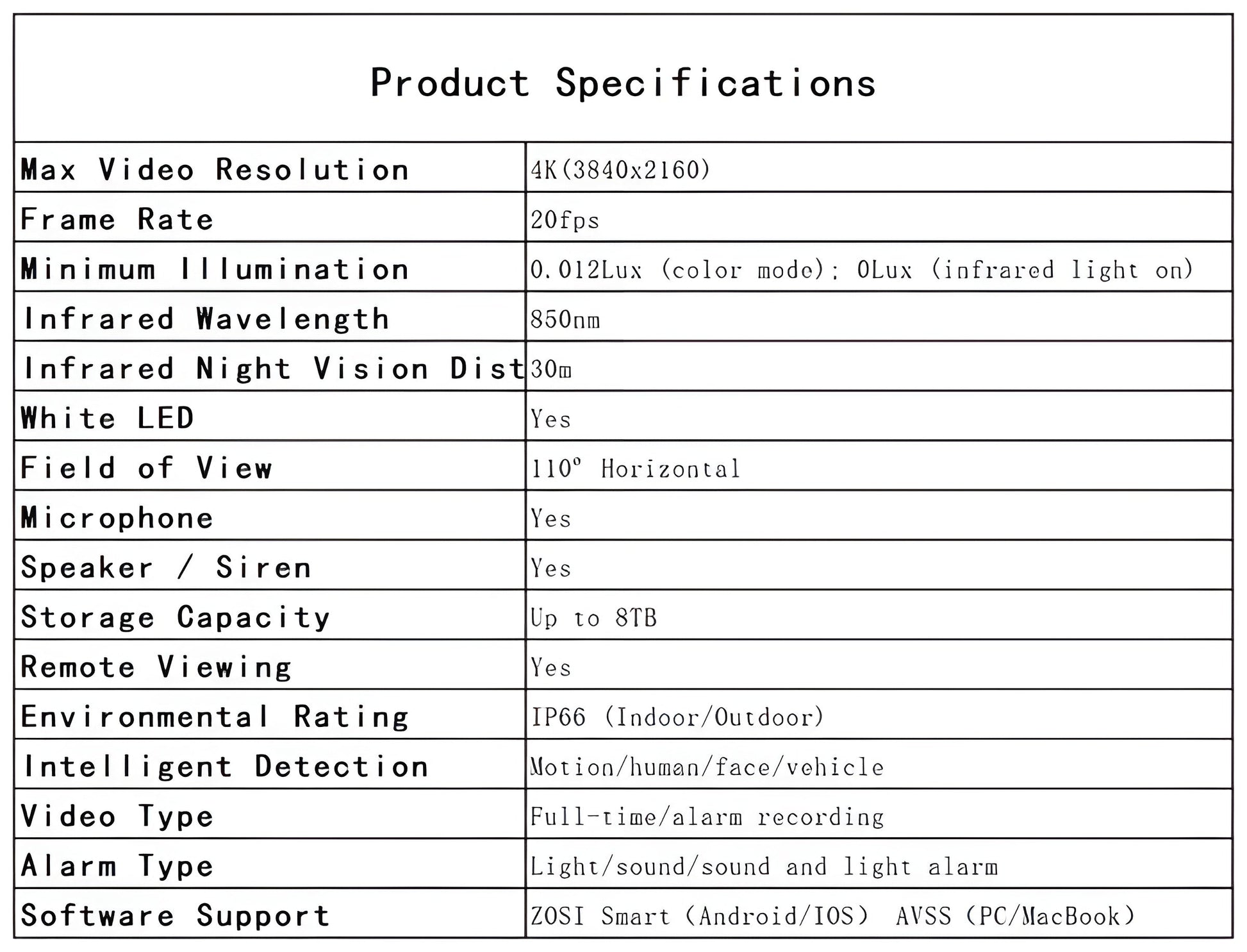 | Minimum Illumination | 0.012Lux (color mode); 0Lux (infrared light on) |
