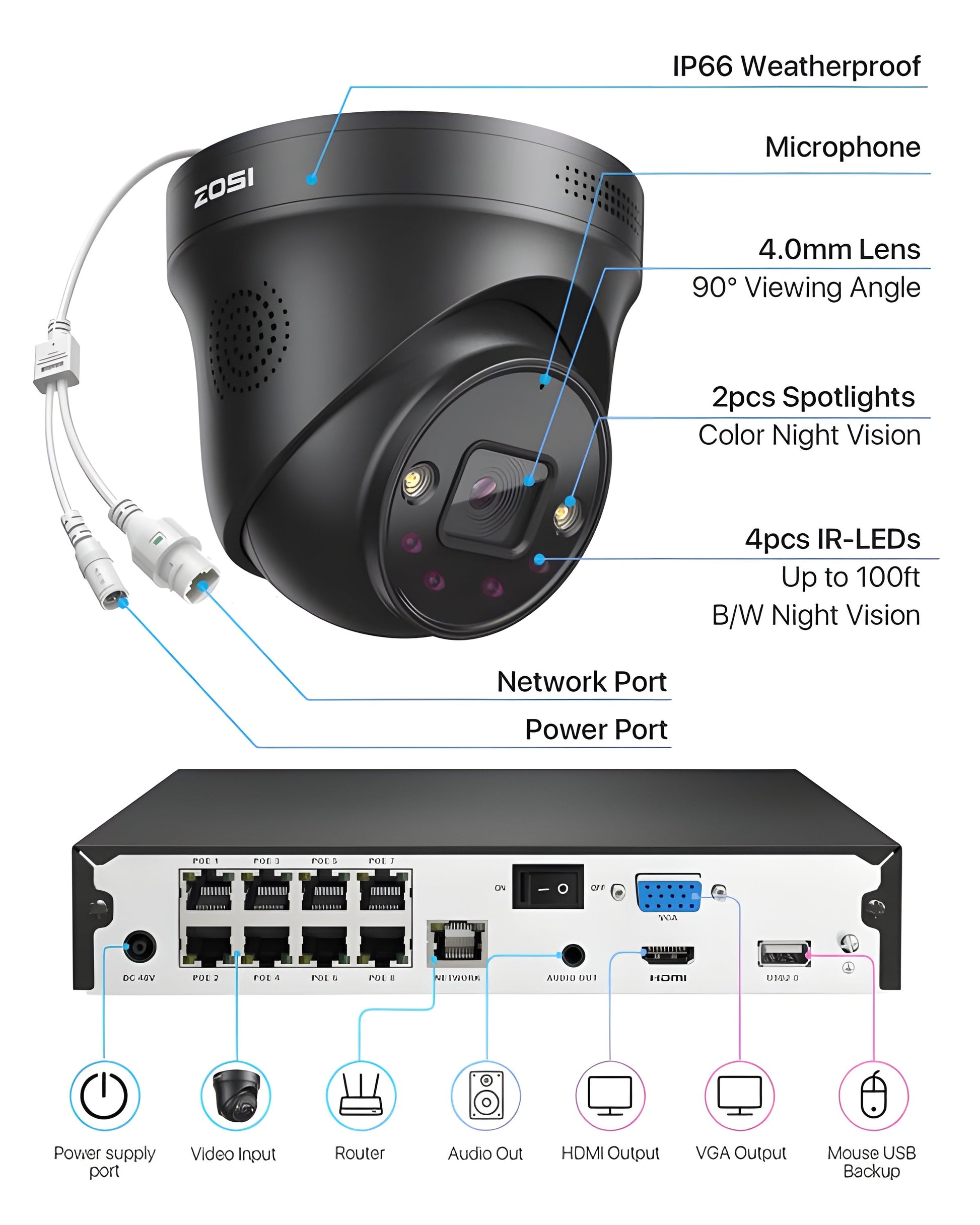 • 4K Ultra HD: 8MP(3840*2160) PoE camera delivers almost 4 times the clarity of 1080p. See clear details even when you digitally zoom in.